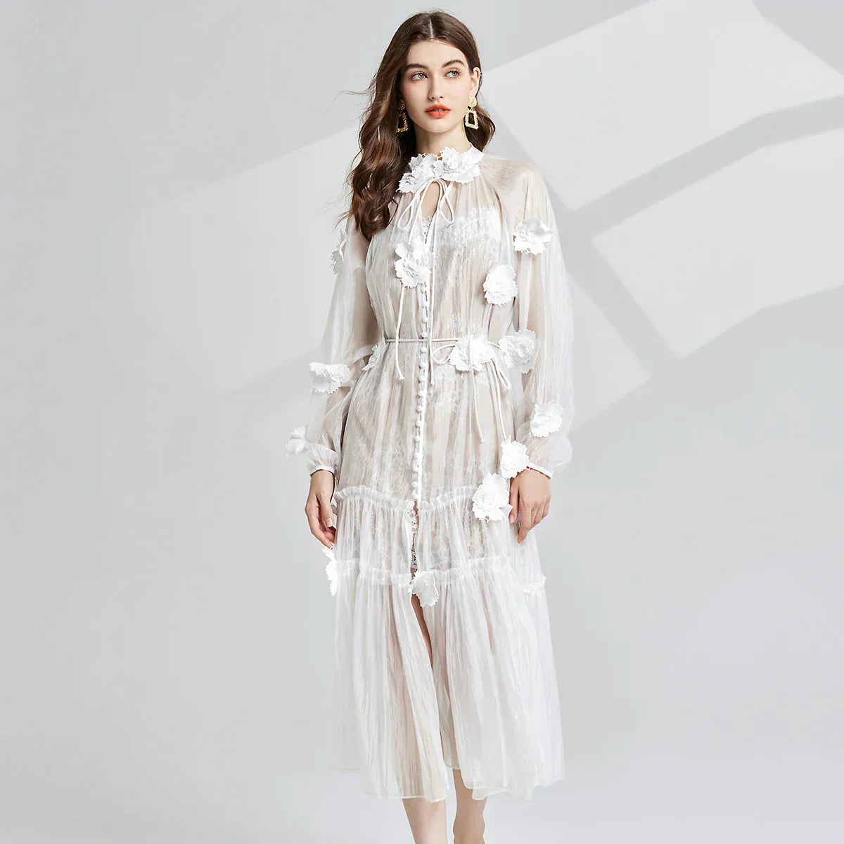 Step into autumn charm with Jessica’s Garden Grace Dress, designed with intricate floral embroidery and an airy, loose silhouette. The O-neckline and lantern sleeves add a touch of romance, making this the ideal piece for any seasonal escape.