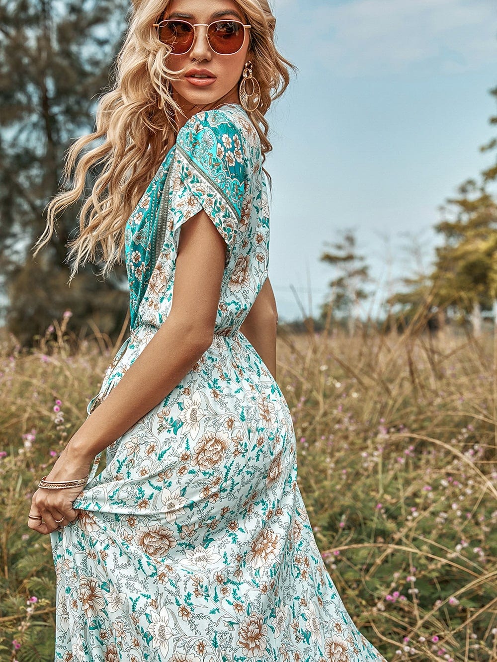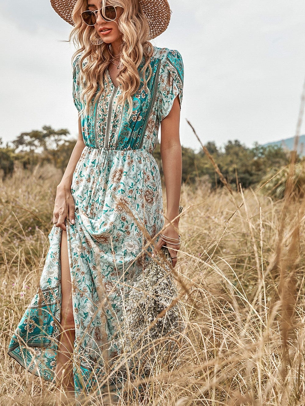 Vibemartini dress is detailed with cute tulip sleeves. Features a v neck line. multicolor print. flowy skirt. and floor-length. Pair it with sunnies and a hat for a chic look.