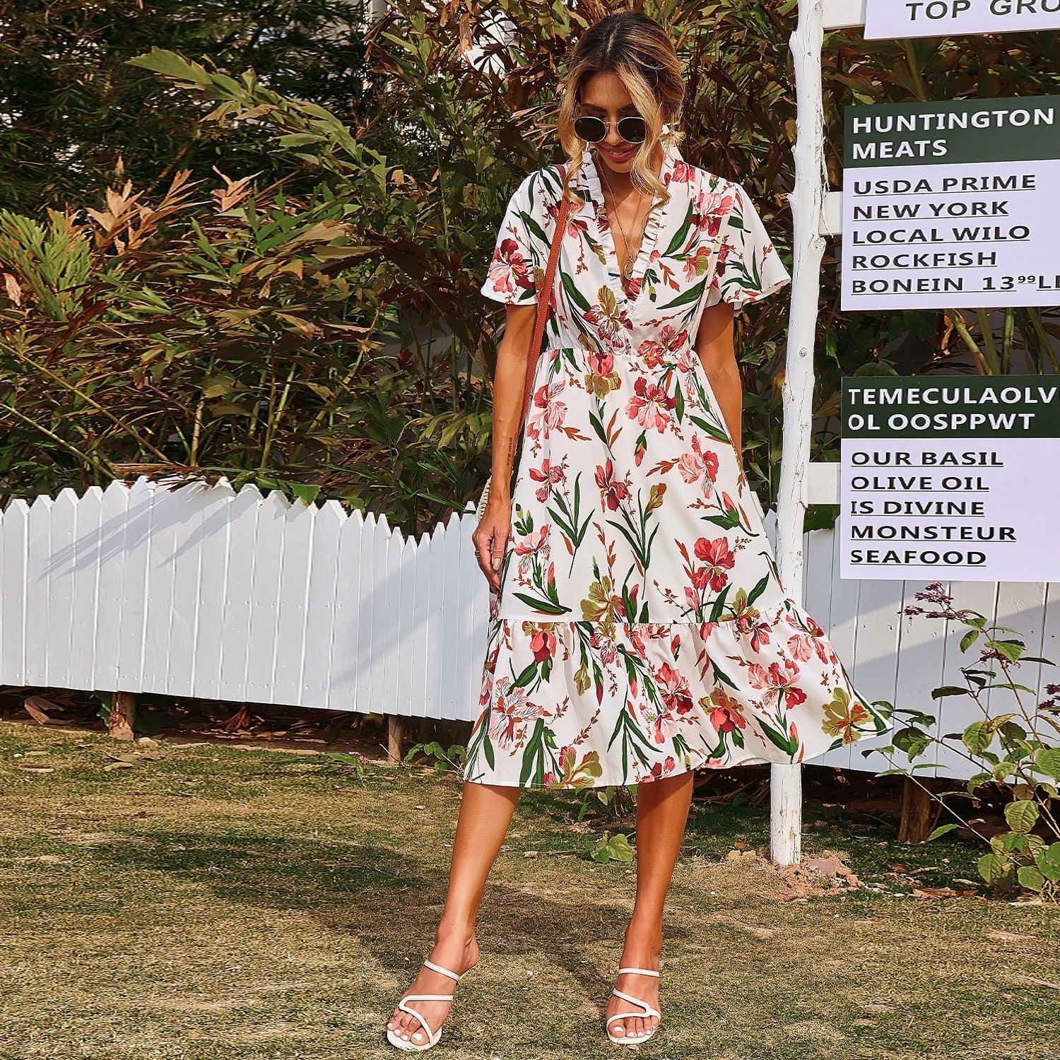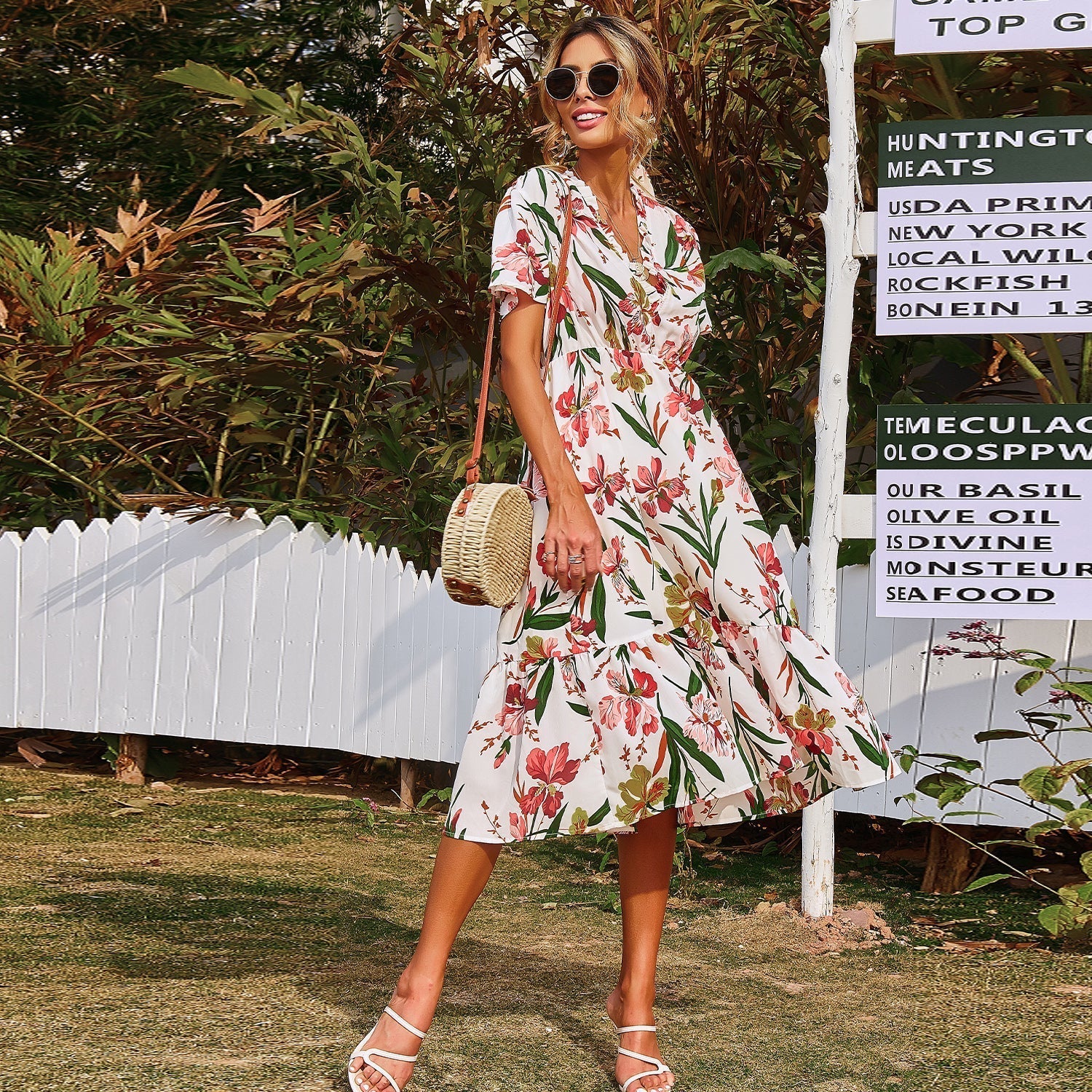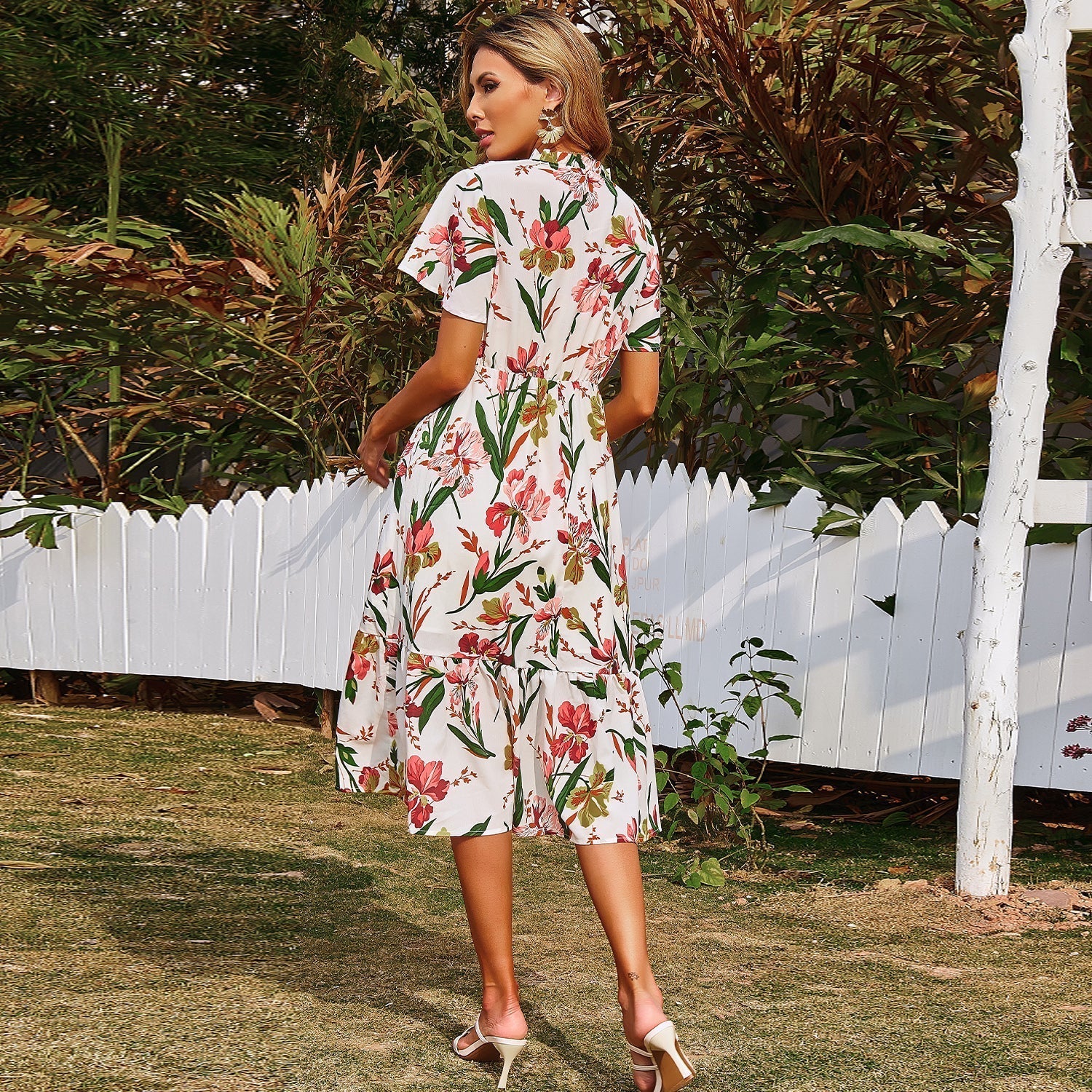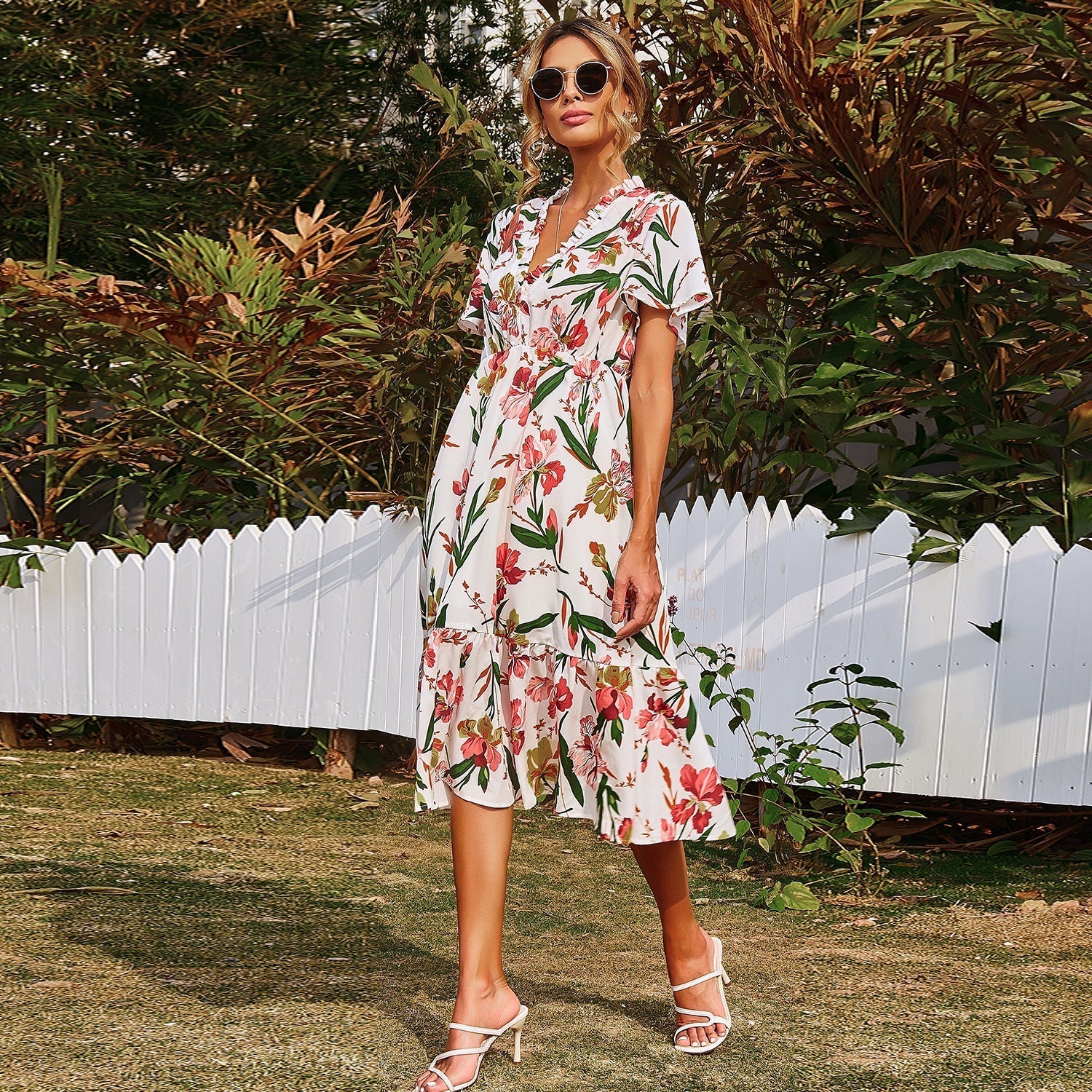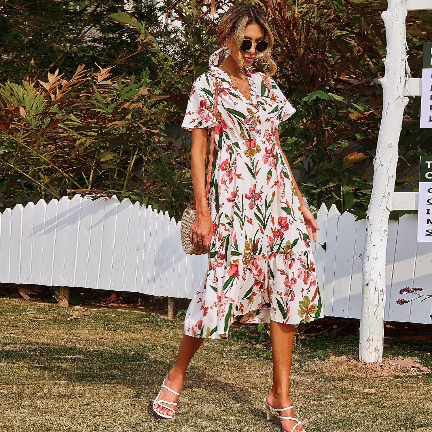 Vibemartini midi dress is detailed with the most gorgeous floral print pattern mixed with pink flowers and green stem leaves. Features a ruffle trim neck line. short sleeves. and below knee midi length. Gorgeous as a paradise vacation dress or a simple brunch look for the weekend.