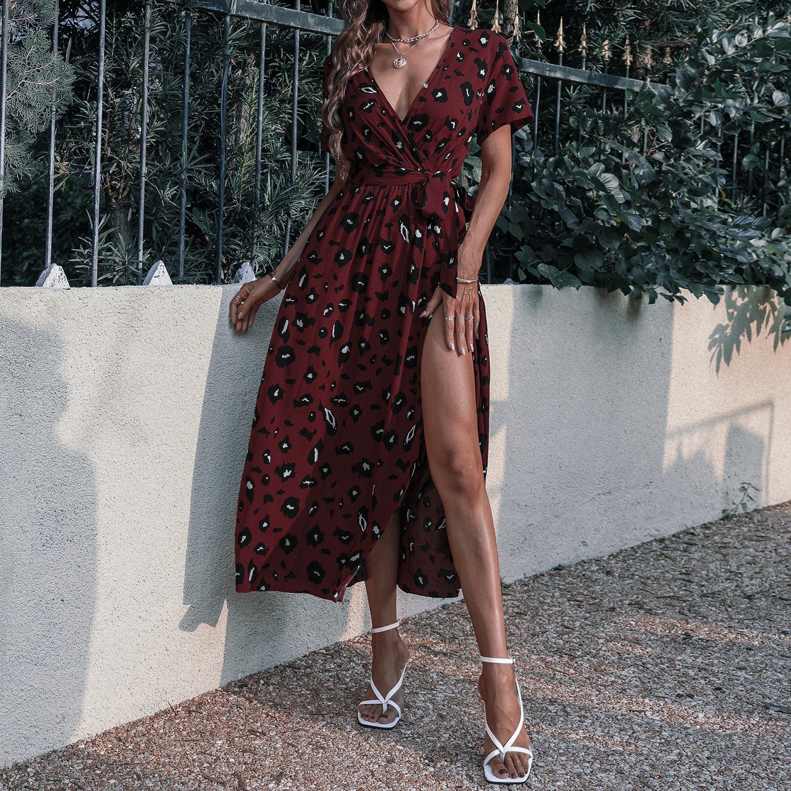 Vibemartini dress is detailed with a bold contrast animal print. Features a surplice neck line. short sleeves. tie waist. wrap style. and above ankle length. Pair it with sneakers and sunnies for a fierce look.