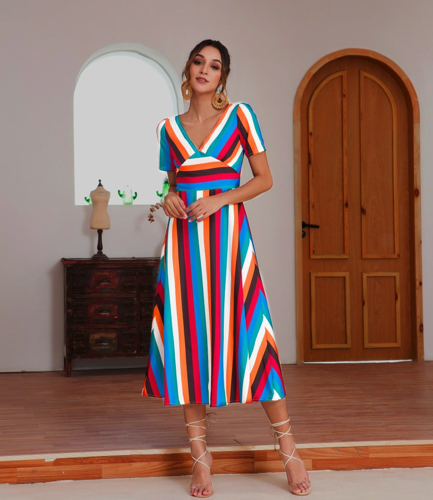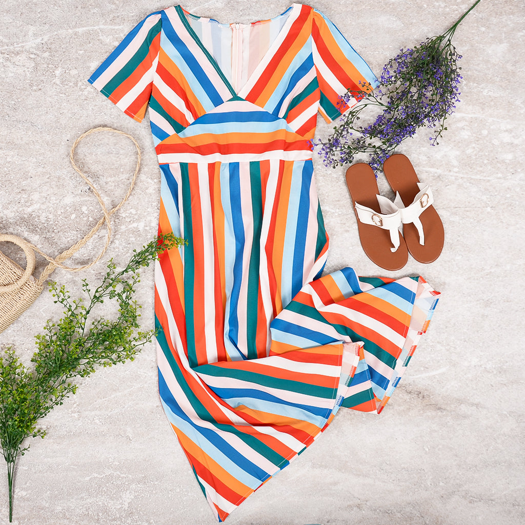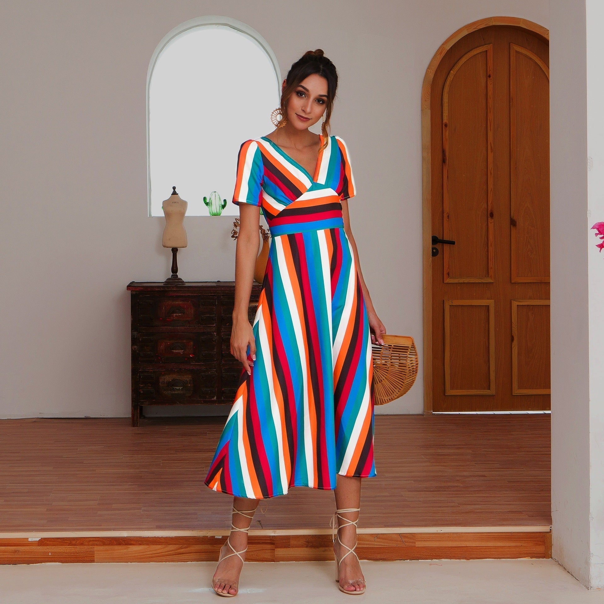 Vibemartini striped maxi dress is detailed with vibrant stripes that cross and cut across the dress. Features a short sleeve. v neckline. and maxi shin length. Made with 100% soft polyester that's light and breathable for casual wear at home or outside on sunny days. A great dress for beach days or vacation!