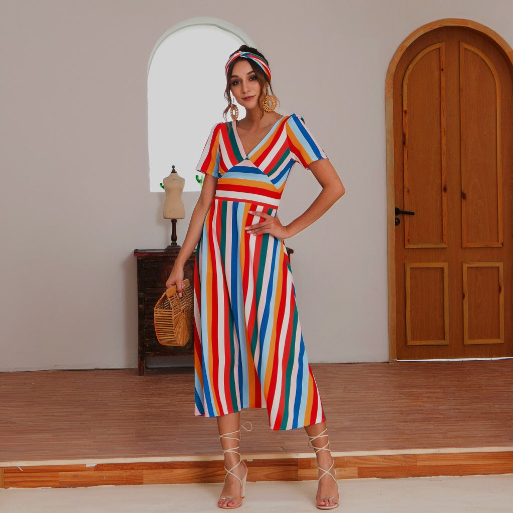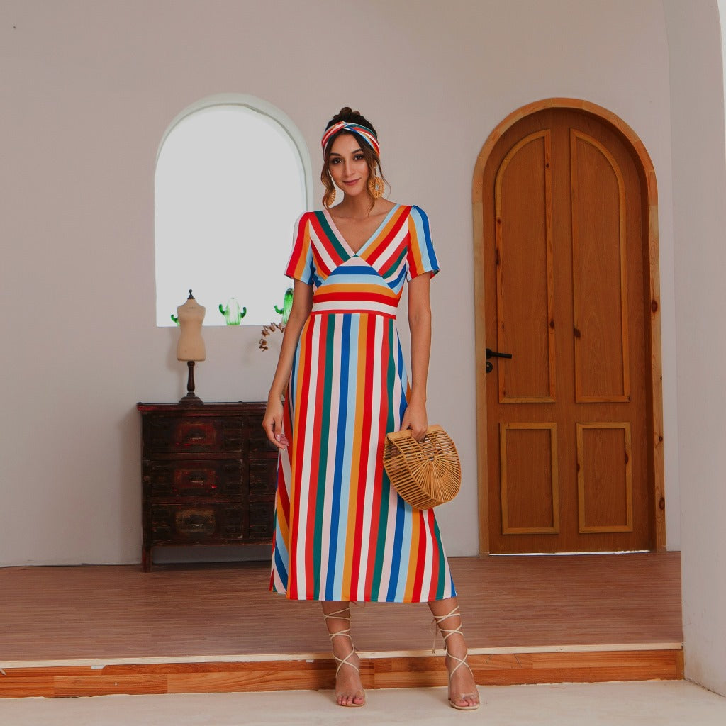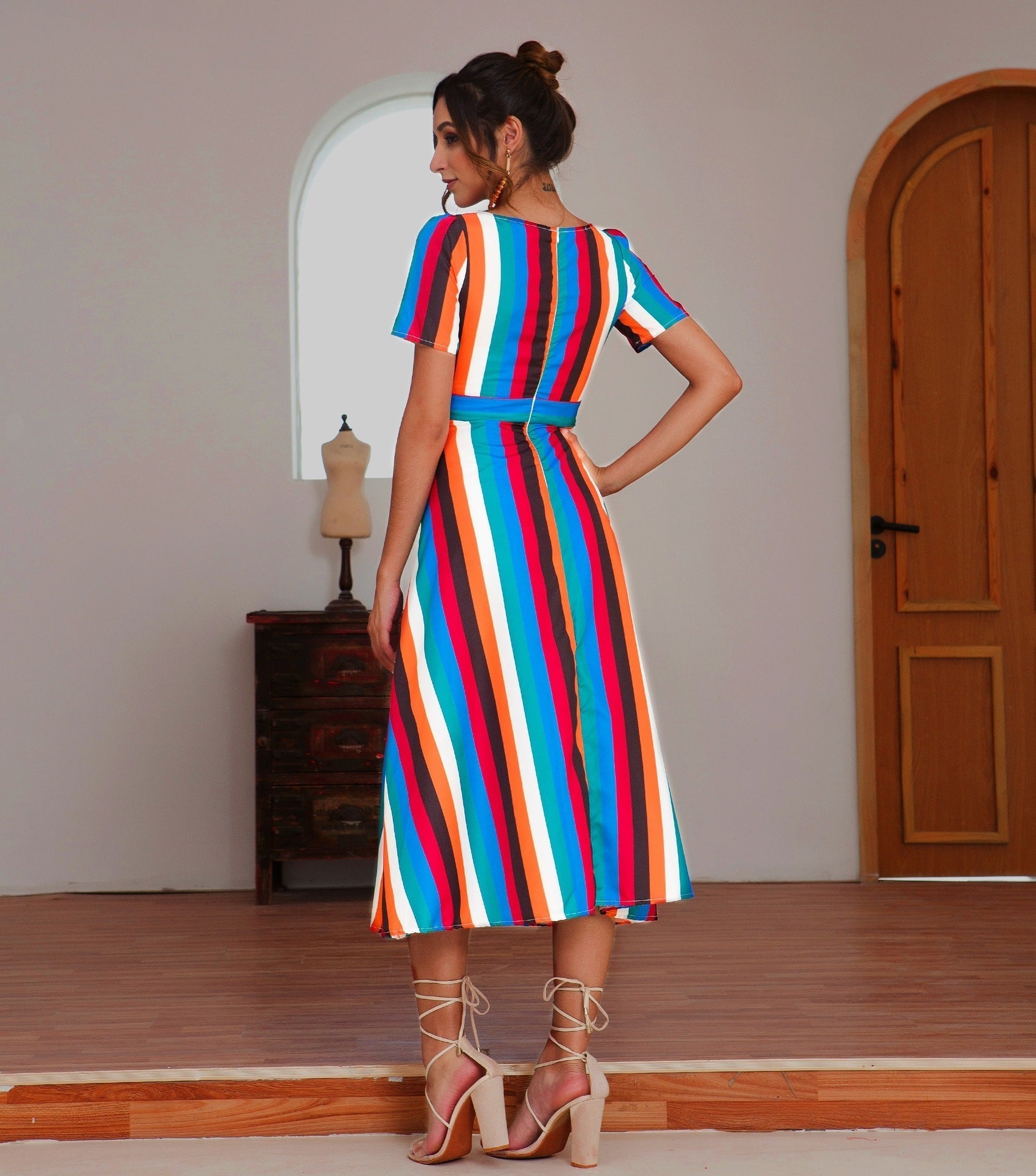 Vibemartini striped maxi dress is detailed with vibrant stripes that cross and cut across the dress. Features a short sleeve. v neckline. and maxi shin length. Made with 100% soft polyester that's light and breathable for casual wear at home or outside on sunny days. A great dress for beach days or vacation!