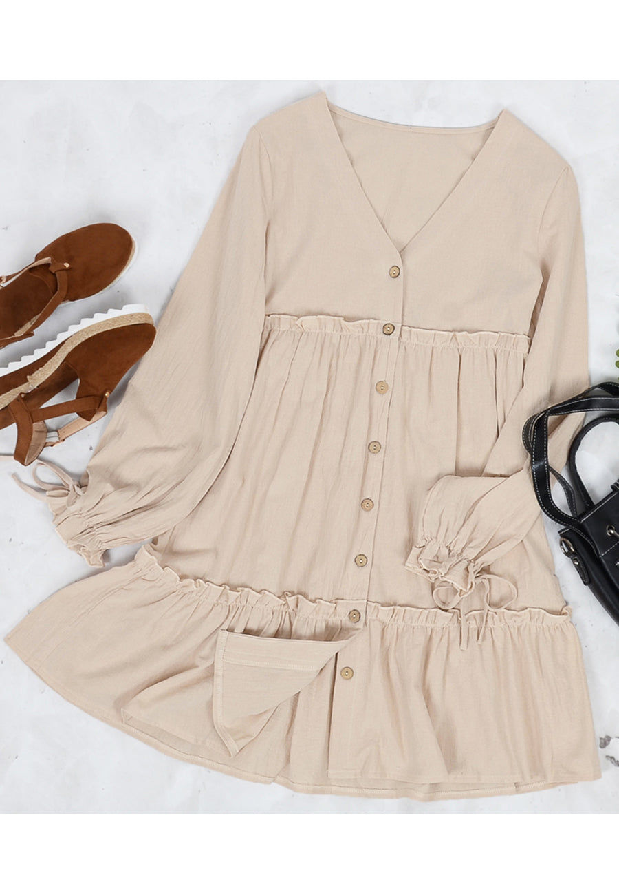 Vibemartini smock dress is detailed with a sexy plunge neck line. Features a button down design. ruffle details. long sleeves. A-line silhouette. and above knee length. Style it with a beret and boots for a chic look.