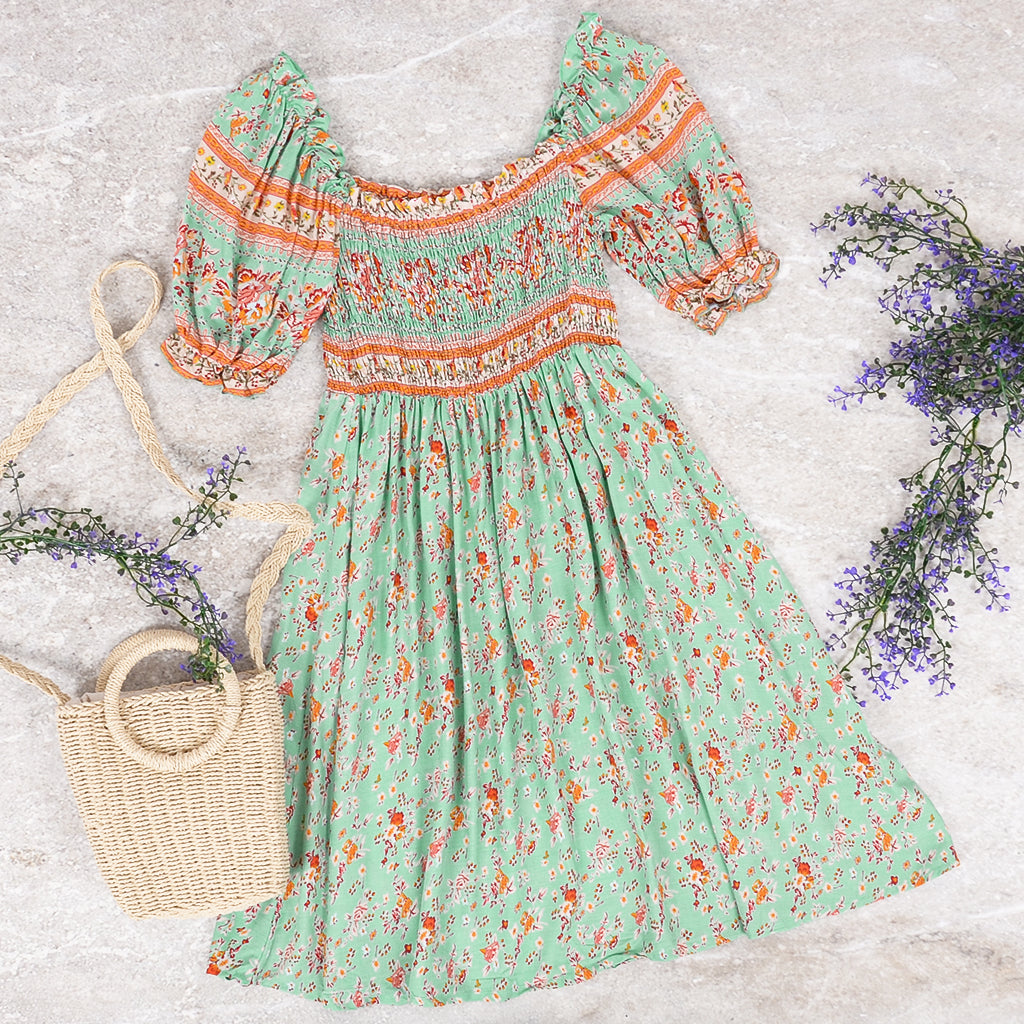 Vibemartini dress is detailed with beautiful floral prints that are inspired by the boho style. Features a straight neckline. shirred bodice. short puff sleeves. A-line silhouette. and above knee length. Style it with a wooden bag and gladiator sandals for a showstopper look.
