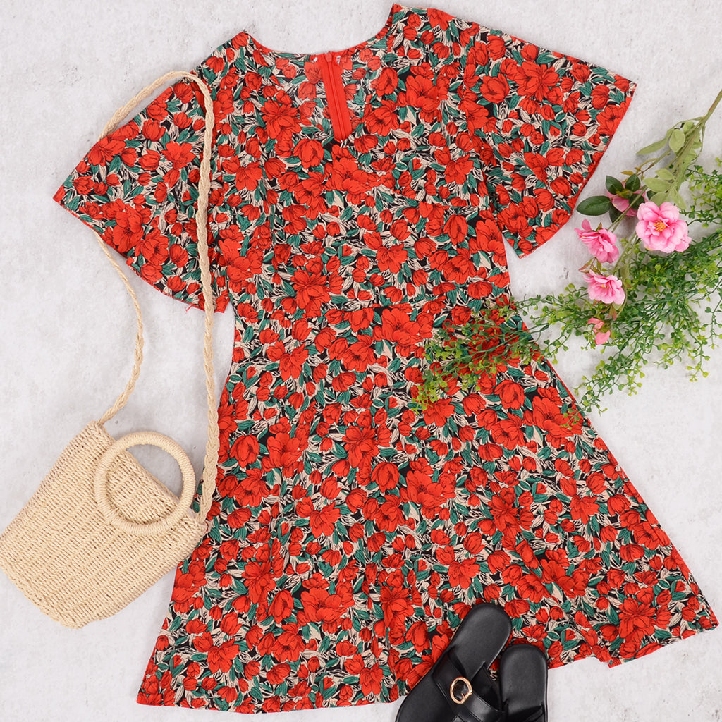Vibemartini rose floral print swing dress is detailed with short ruffle sleeves. vibrant rose flower patterns. and ruffle hem. The a ling dress features a v neck line and above knee length making it a great casual daily wear dress. Made with 100% soft polyester and spandex blend that's light and breathable for wear in the sun. Easily Pair this dress with your best heels or sandals and your favorite summer accessories.