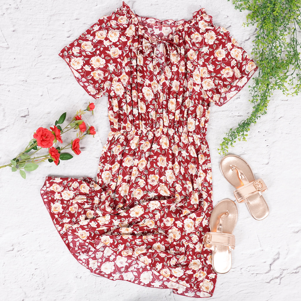 Vibemartini dress is detailed with a feminine tie neck design that allows the dress to be worn regularly or off-the-shoulder. Features short sleeves. floral print. cinched waist. flowy skirt. and above knee length. Pair it with a basket bag and strappy sandals for a dazzling summer look.
