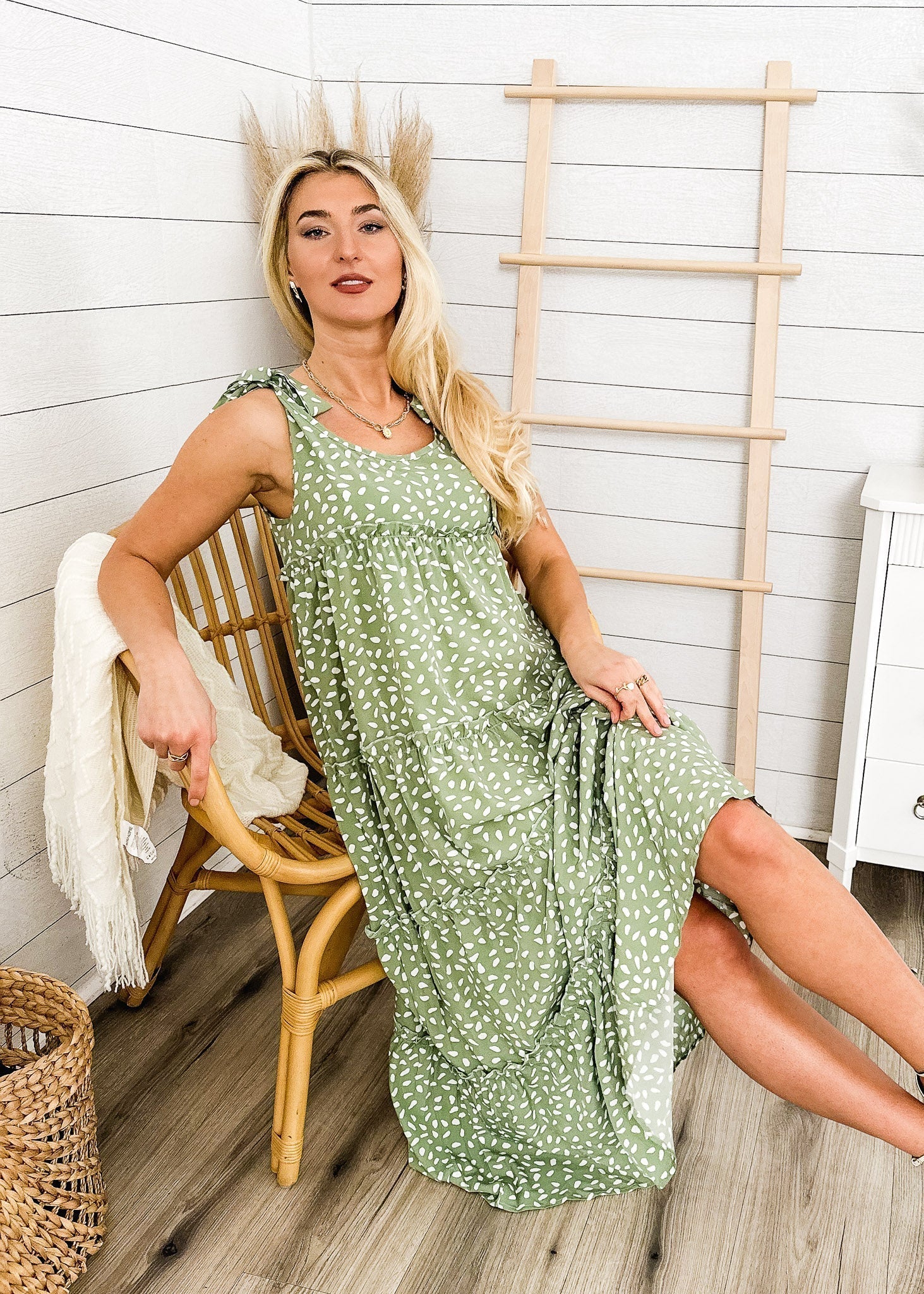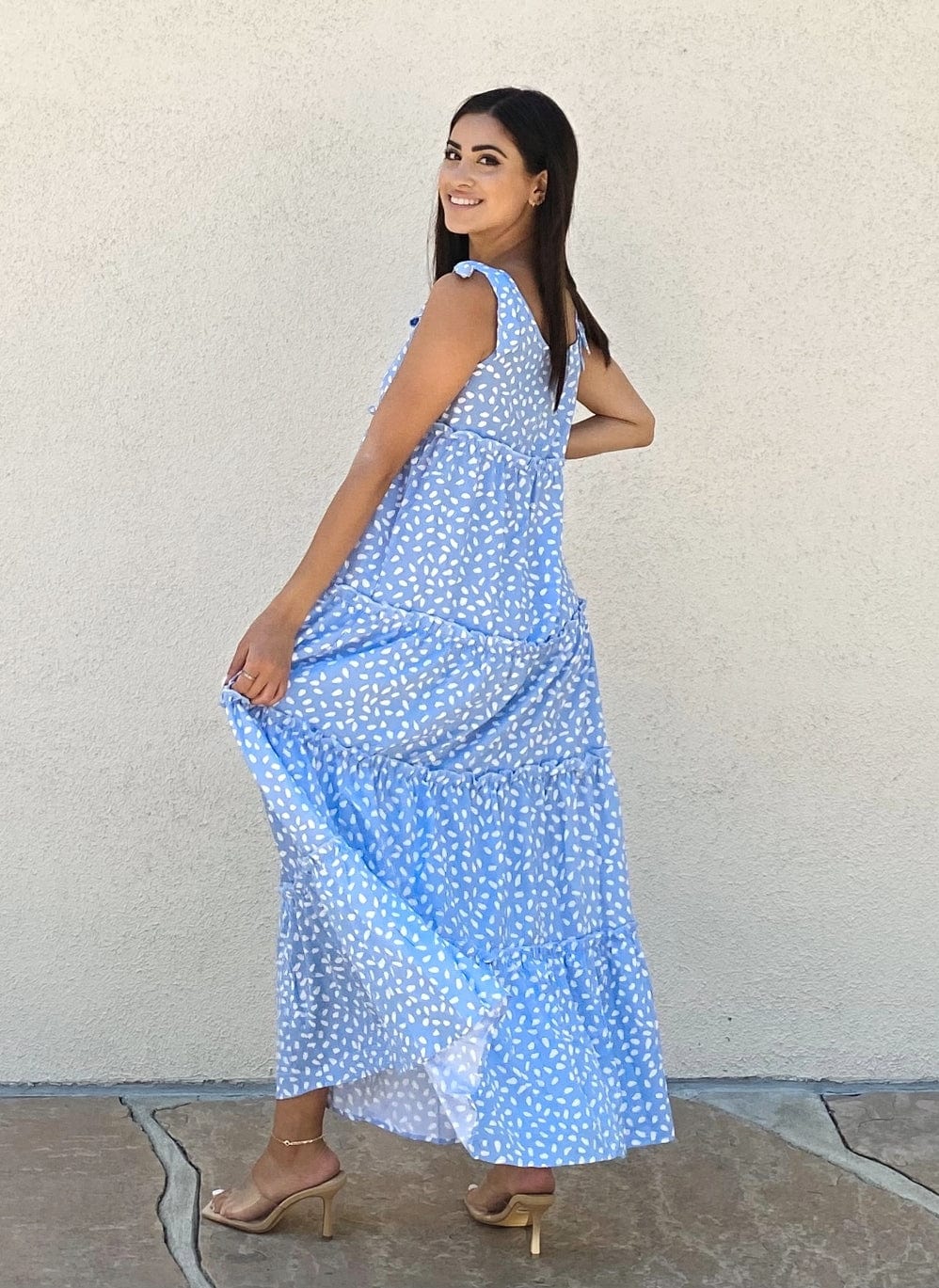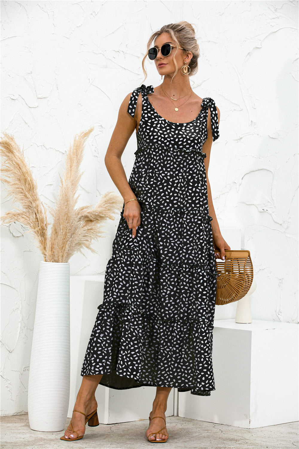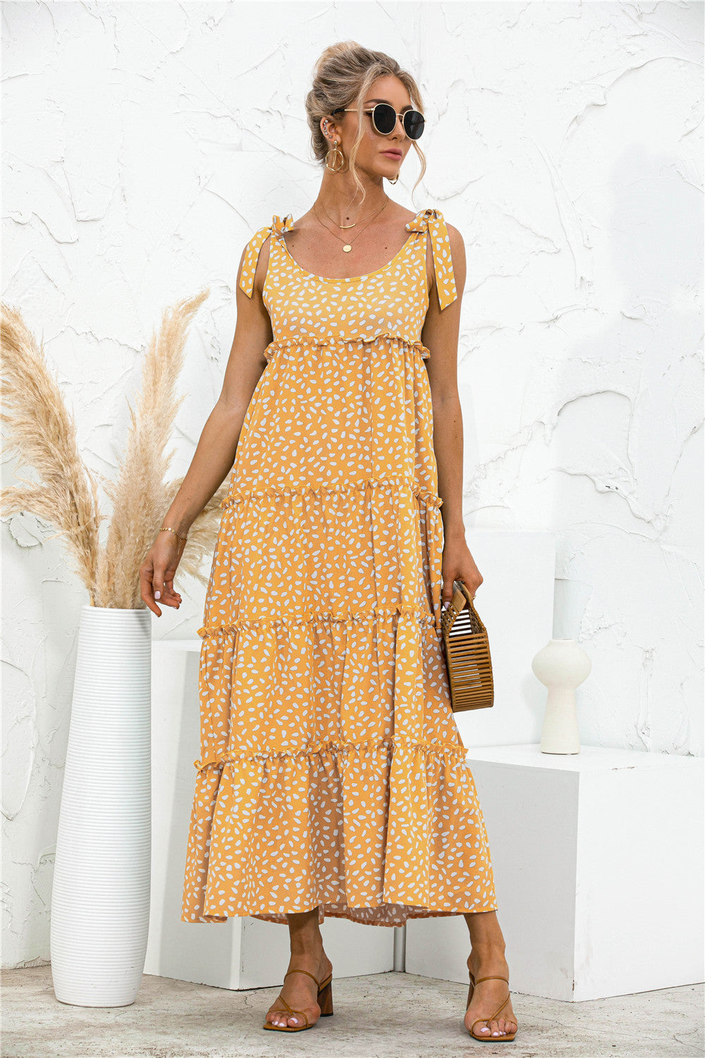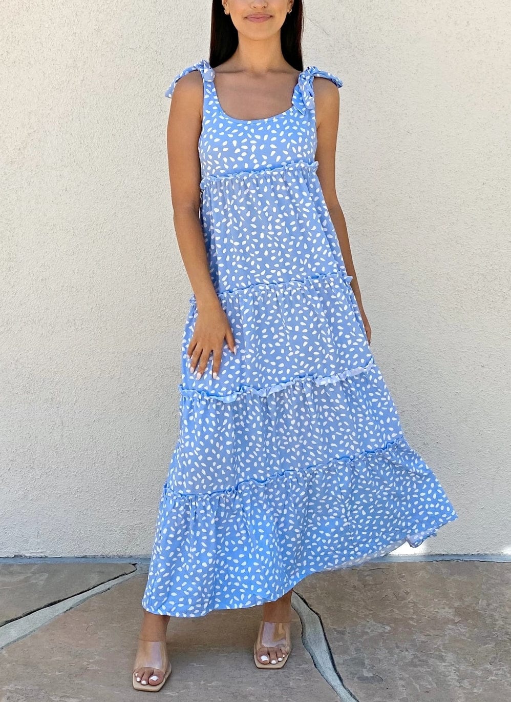 Vibemartini dress is detailed with a beautiful tie shoulder detail. Features a round neck line. printed design. tiered dress. flowy skirt. and above ankle length. Pair it with strappy heels and a handbag for a gorgeous summer look.