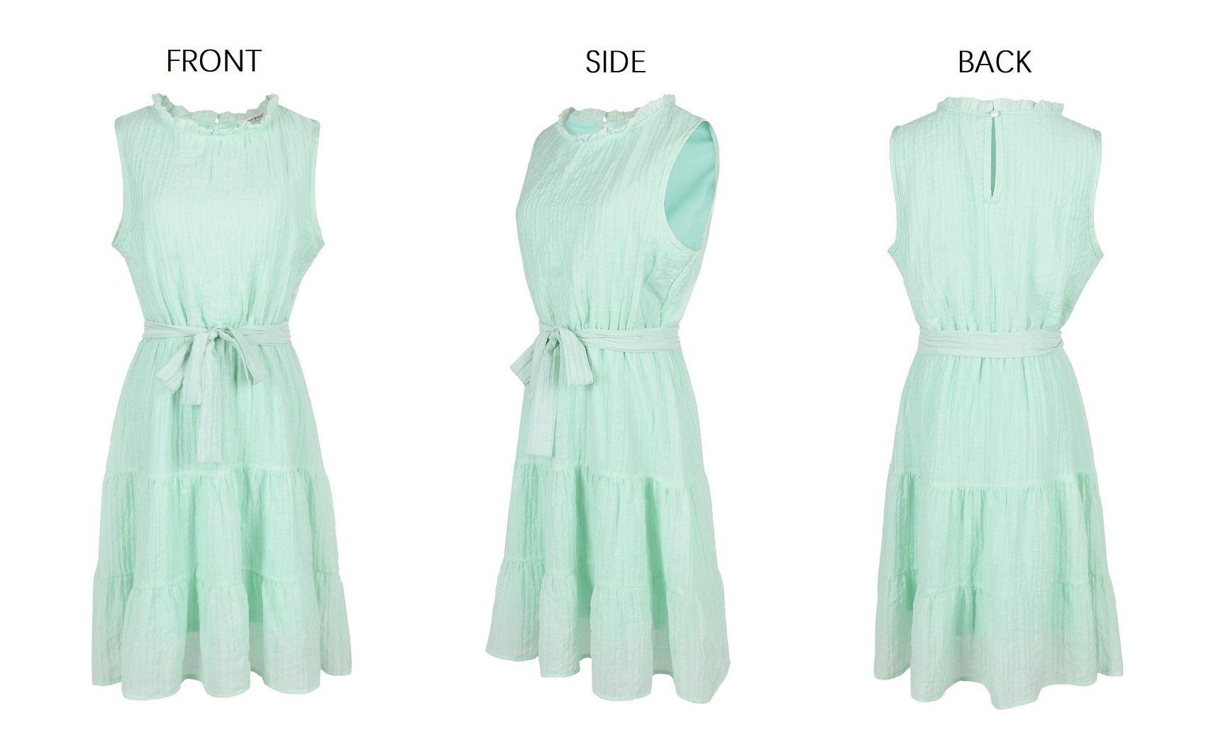 Vibemartini dress is detailed with a unique wrinkled style fabric. Features a ruffle high neck line. sleeveless. tie waist belt. tiered design. and above knee length. Pair it with a clutch bag and stilettos for a bold look.