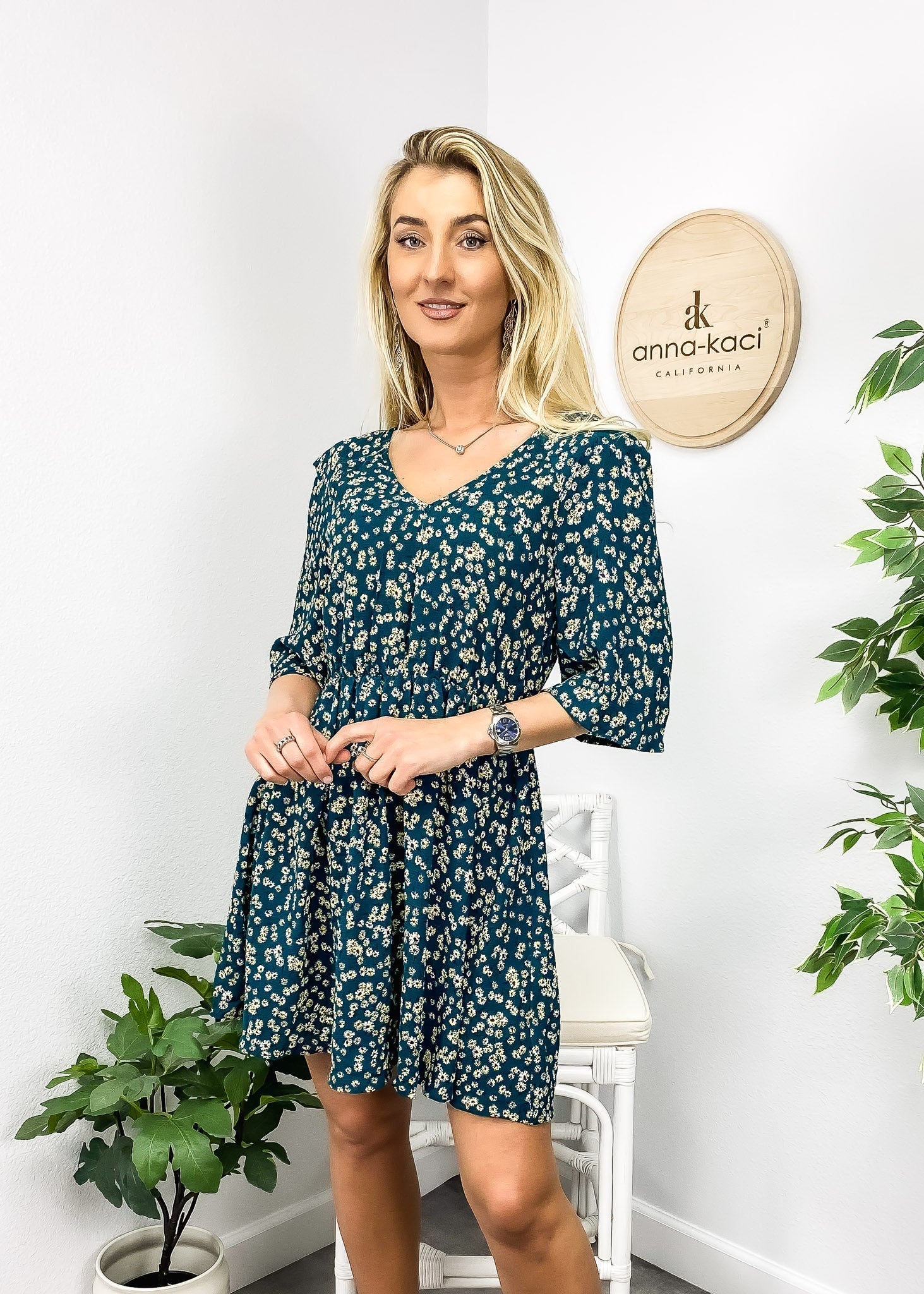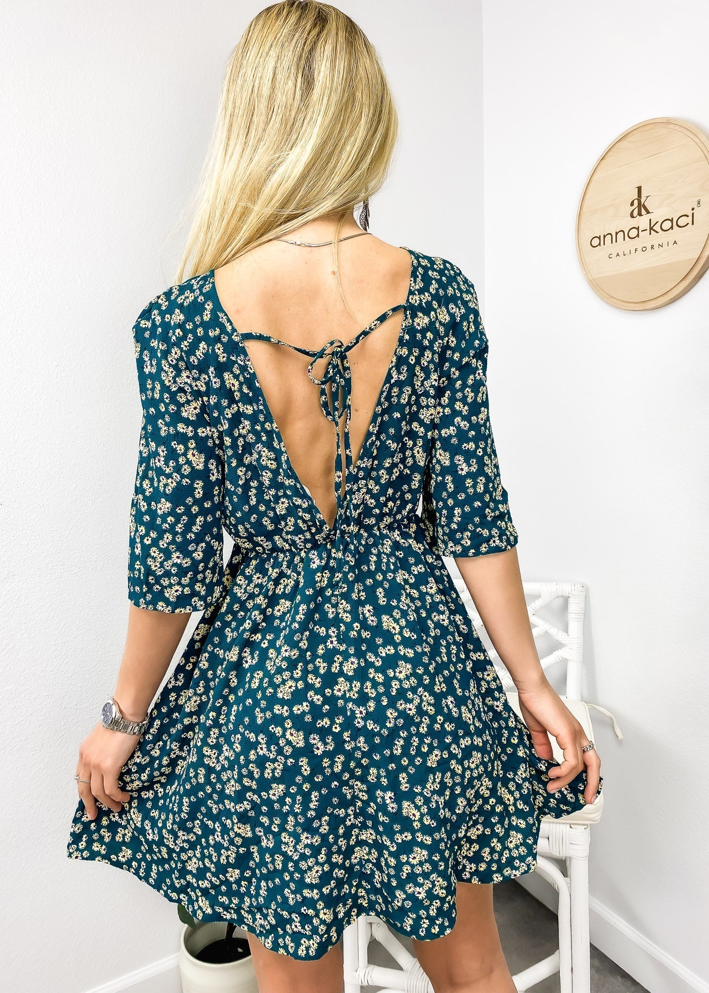 Vibemartini dress is detailed with a flirty tie-back detail. Features a floral print. v neck line. elbow length sleeves. flowy skirt. and above knee length. Pair it with a bucket hat and sneakers for an easygoing look.