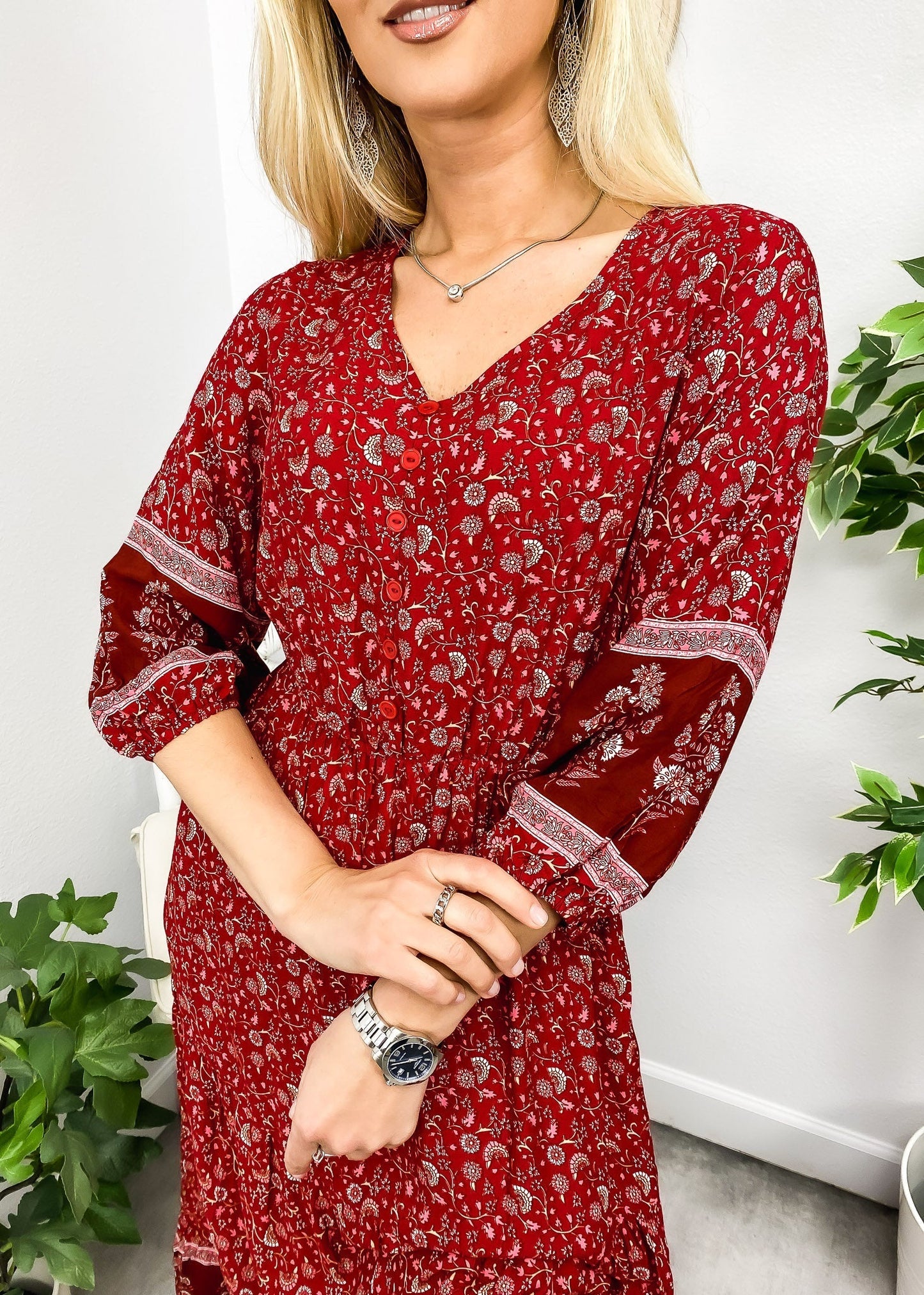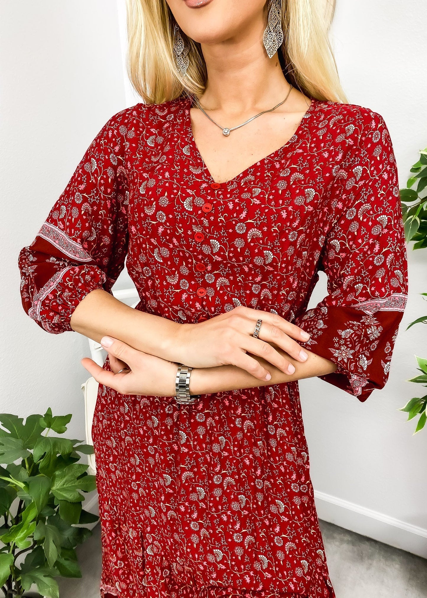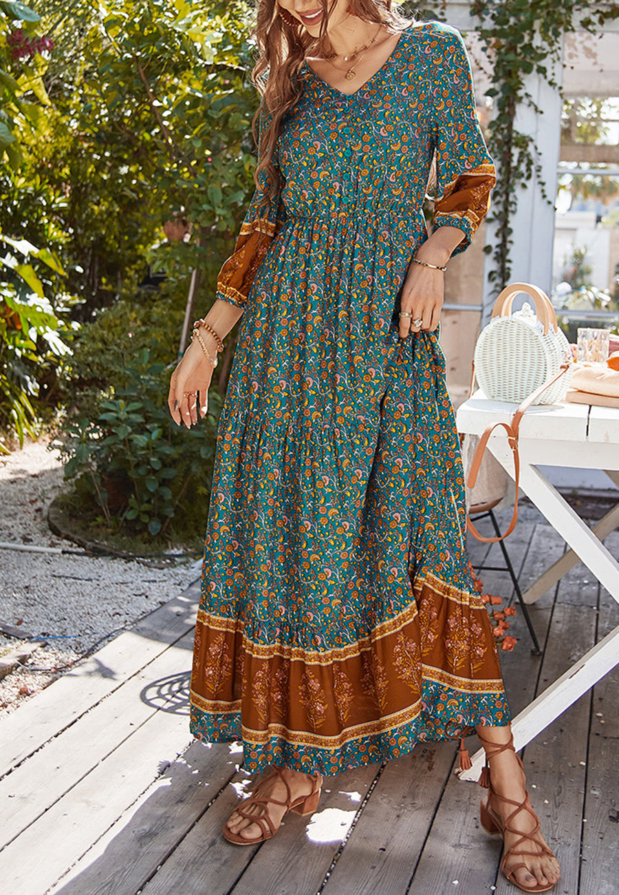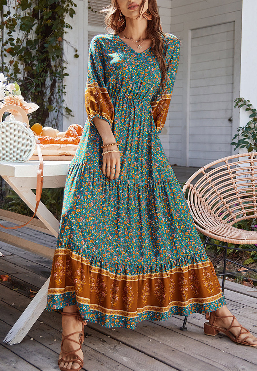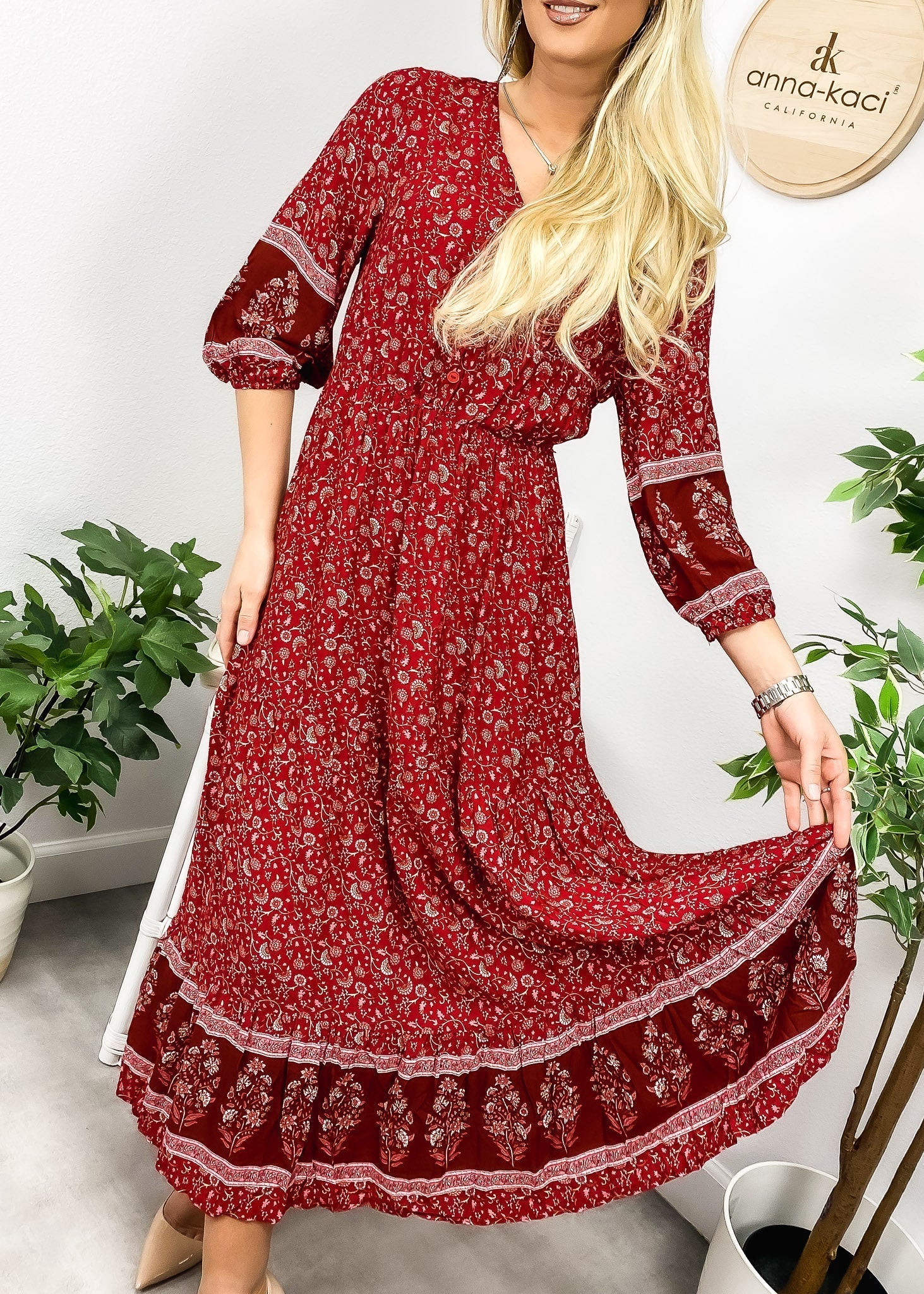 Vibemartini dress is detailed with a classic v neck line. Features a bohemian print. three quarter length sleeves. flowy skirt. and above ankle length. Pair it with a sun hat and sandals for an amazing look.