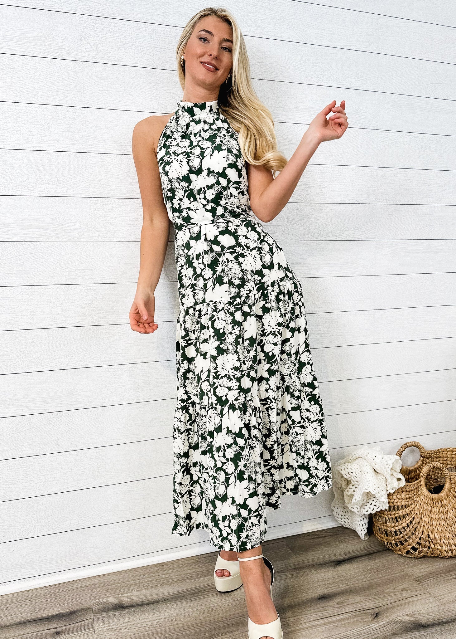Vibemartini dress is detailed with a flirty halter neck line. Features floral prints. tie waist. tiered design. flowy skirt. and above ankle length. Pair it with heels and a hand bag for an extraordinary look this season.