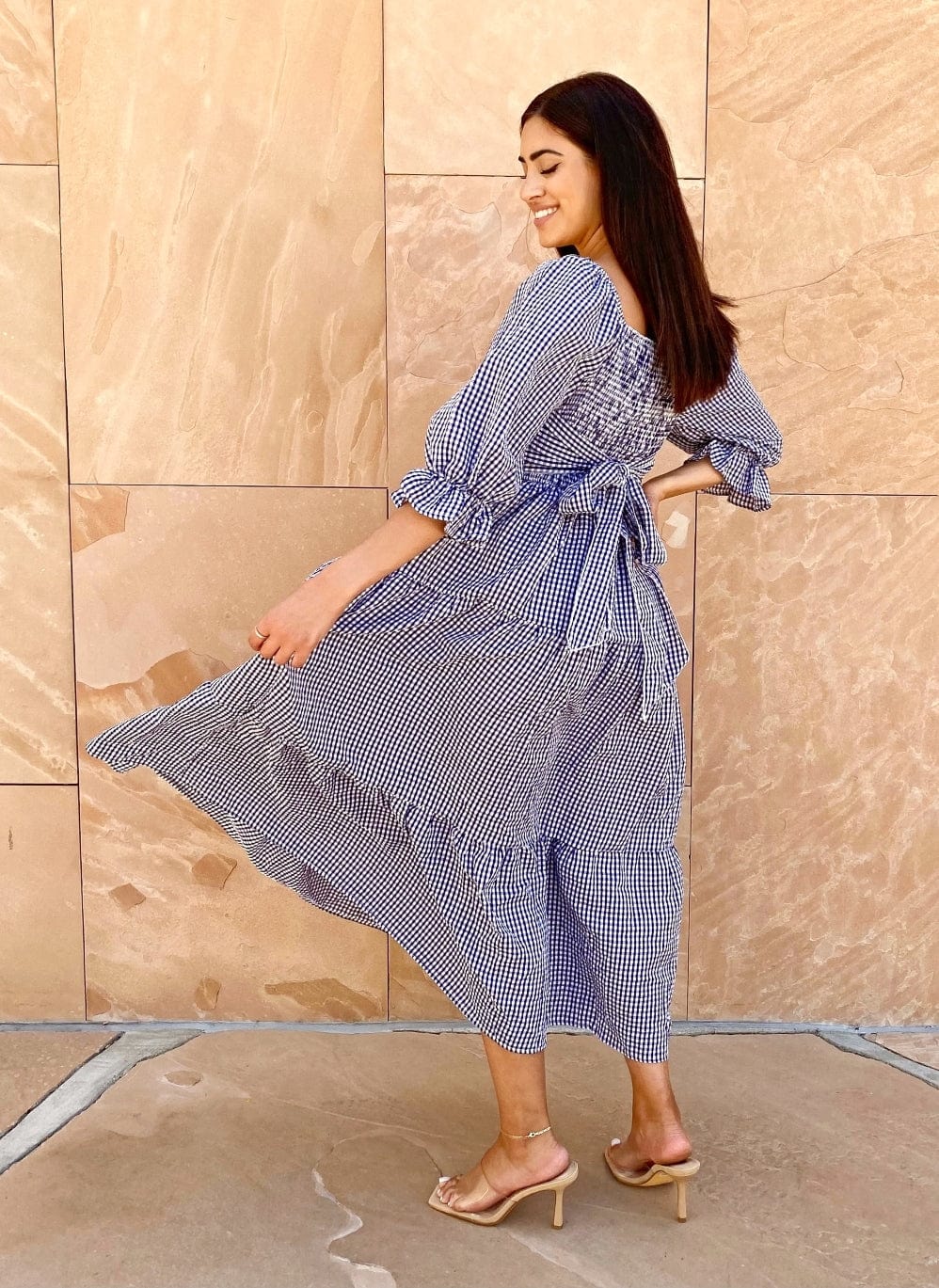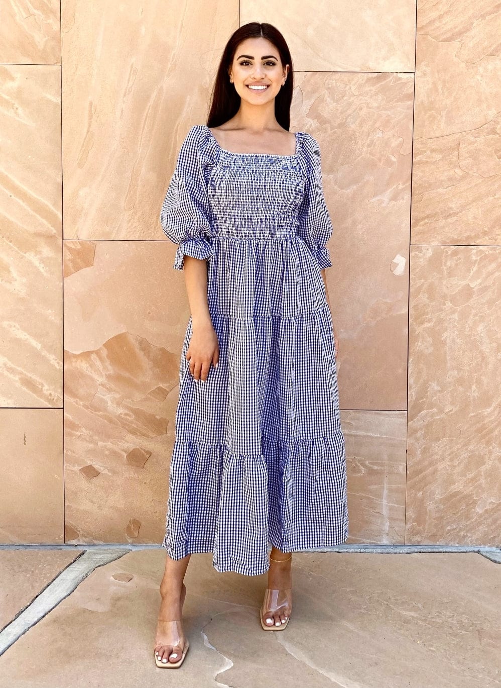 Vibemartini dress is detailed with a classic gingham print. Features a straight neck line. shirred bodice. short puff sleeves. tiered skirt. flowy skirt. and above ankle length. Pair it with block heels and a baguette bag for a cute look.