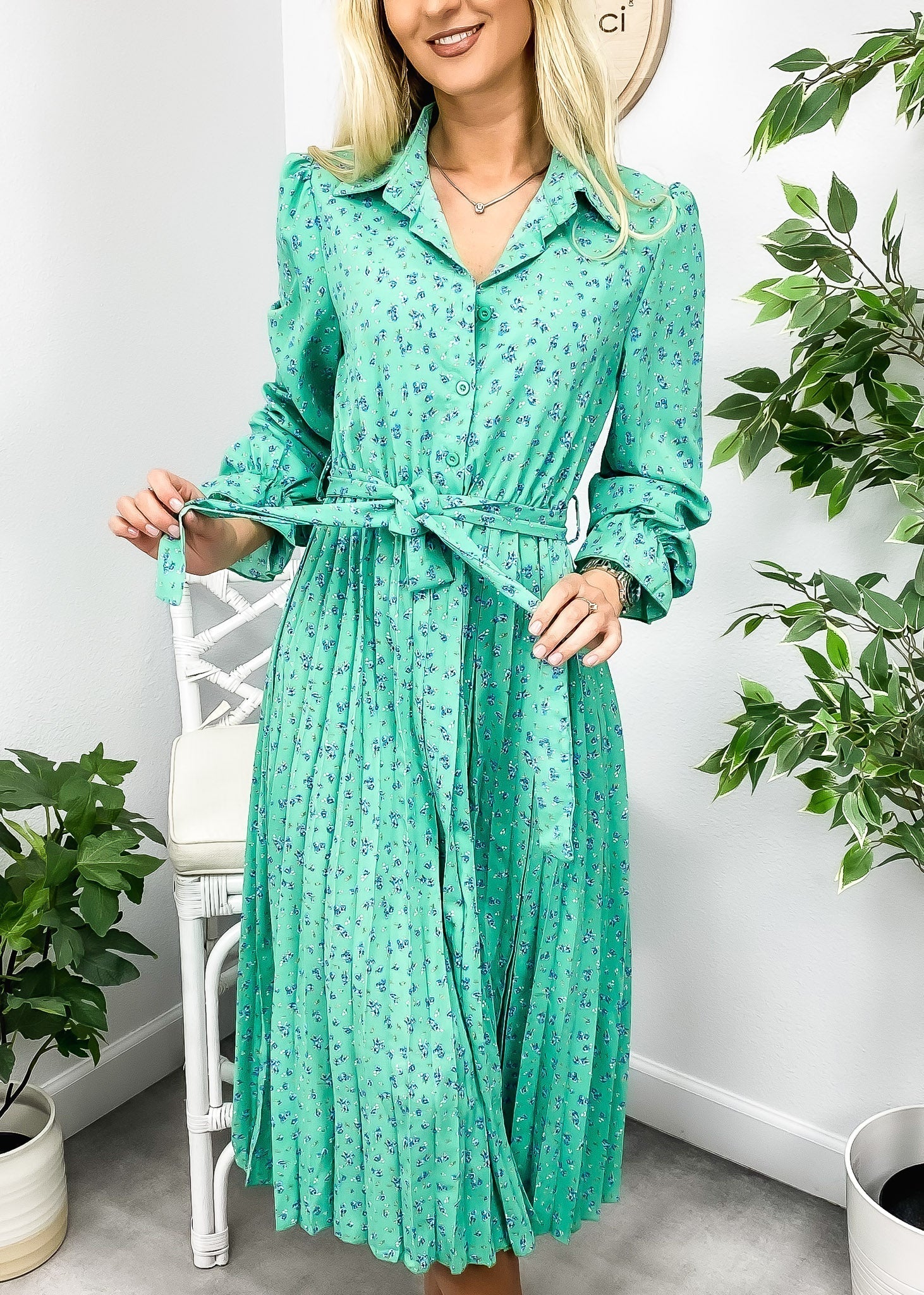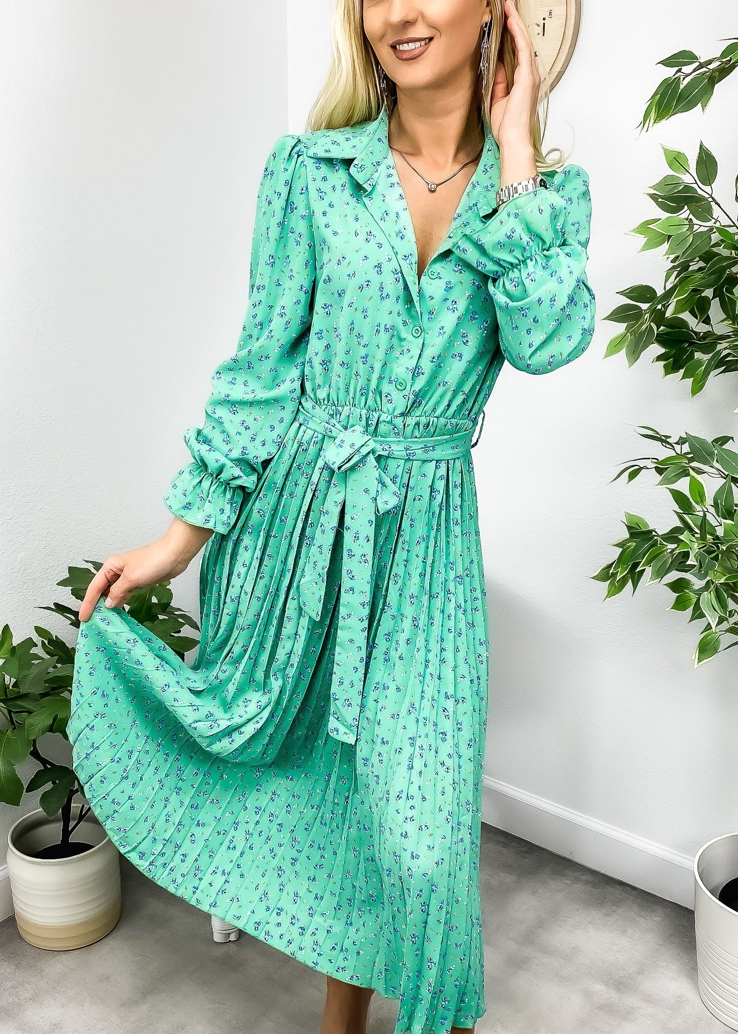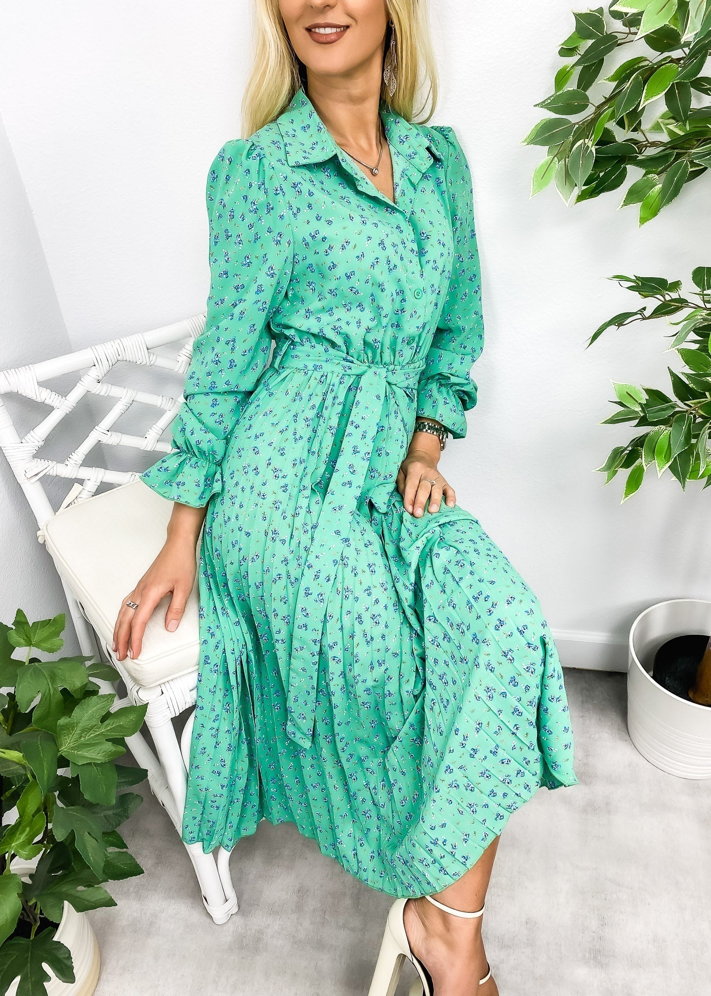 Vibemartini dress is detailed with beautiful pleats on the skirt. Features a floral print. collar. button front design. flowy skirt. and mid-calf length. Pair it with ankle boots and a fedora hat for a chic look.