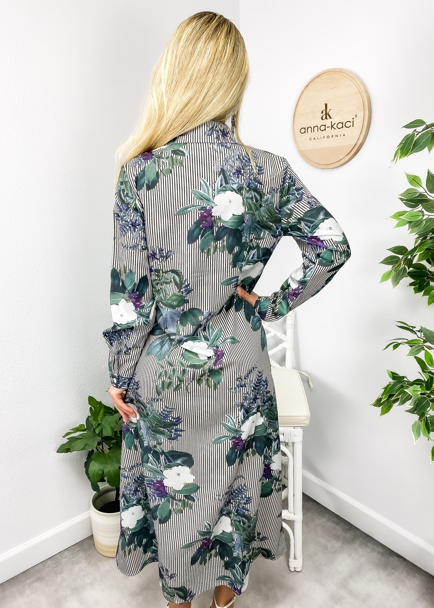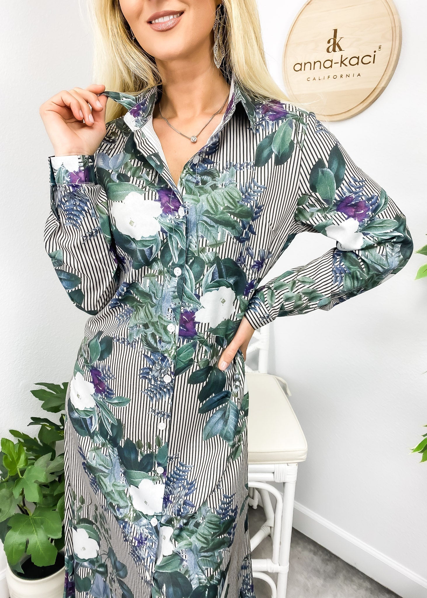 Vibemartini dress is detailed with fun multi-prints. Features a collar. button down closure. long sleeves. front slit. straight cut silhouette. and above ankle length. Pair it with denim jeans and heeled boots for a chic look.