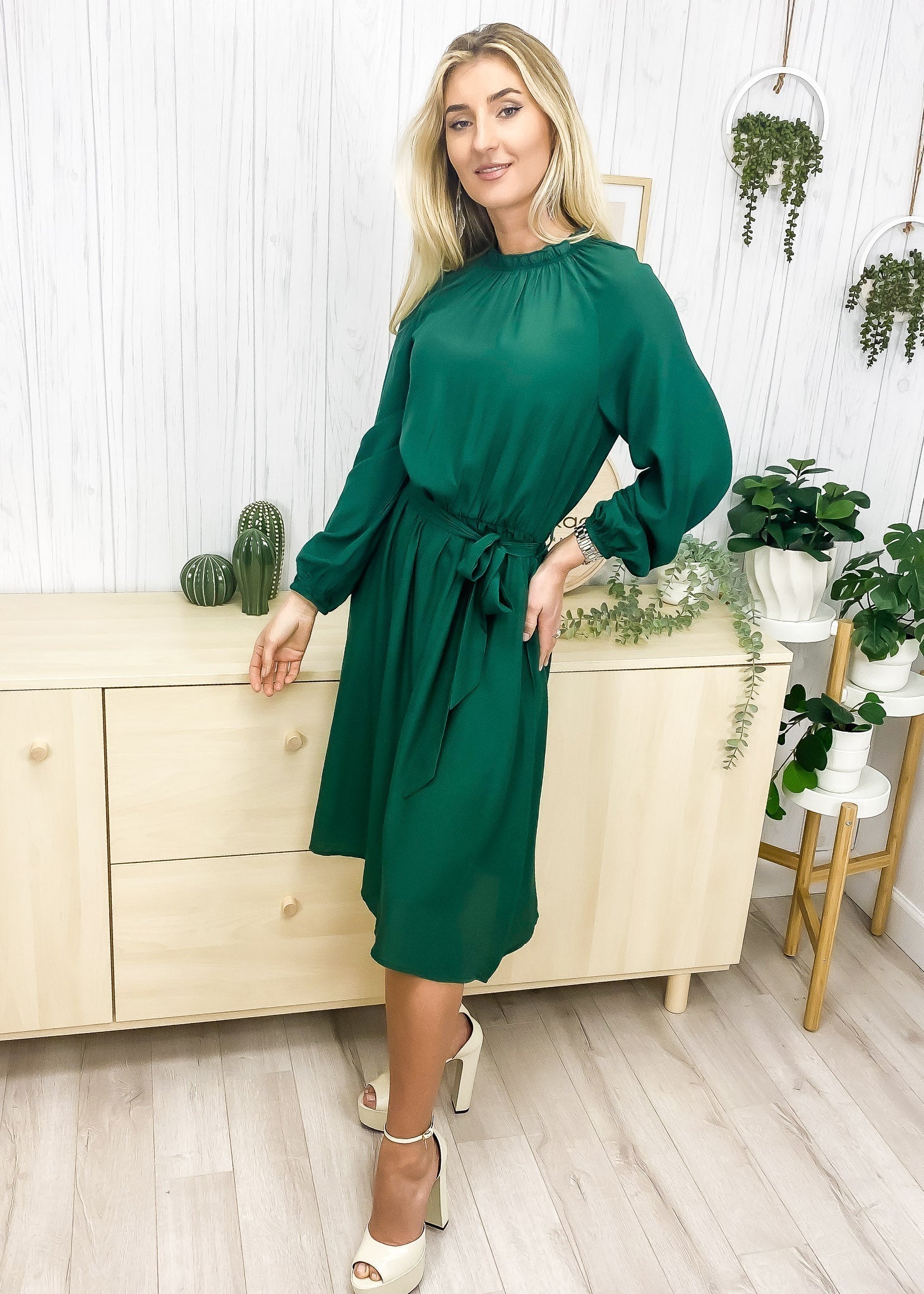 Vibemartini dress is detailed with a beautiful ruffle neck and cinched tied waist. Features a vibrant solid color. long sleeves. flowy ruffle skirt. and knee length. Pair it with a fedora hat and heeled boots for an amazing look.