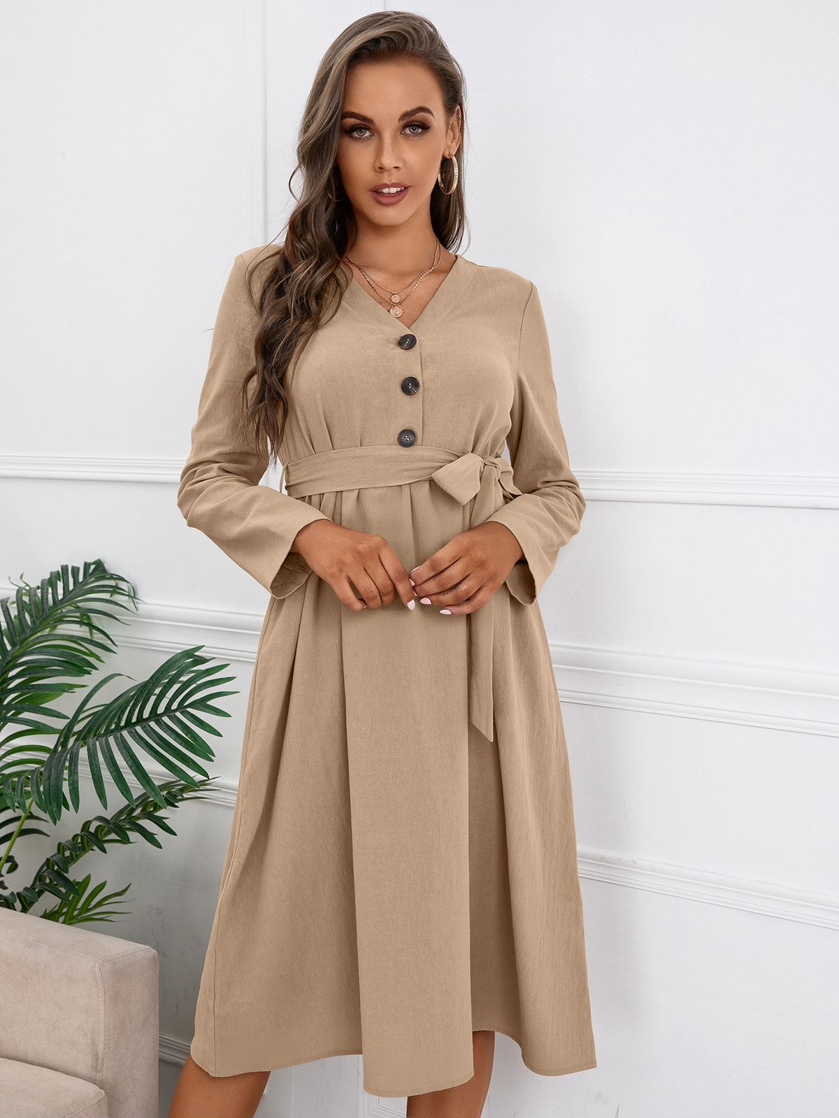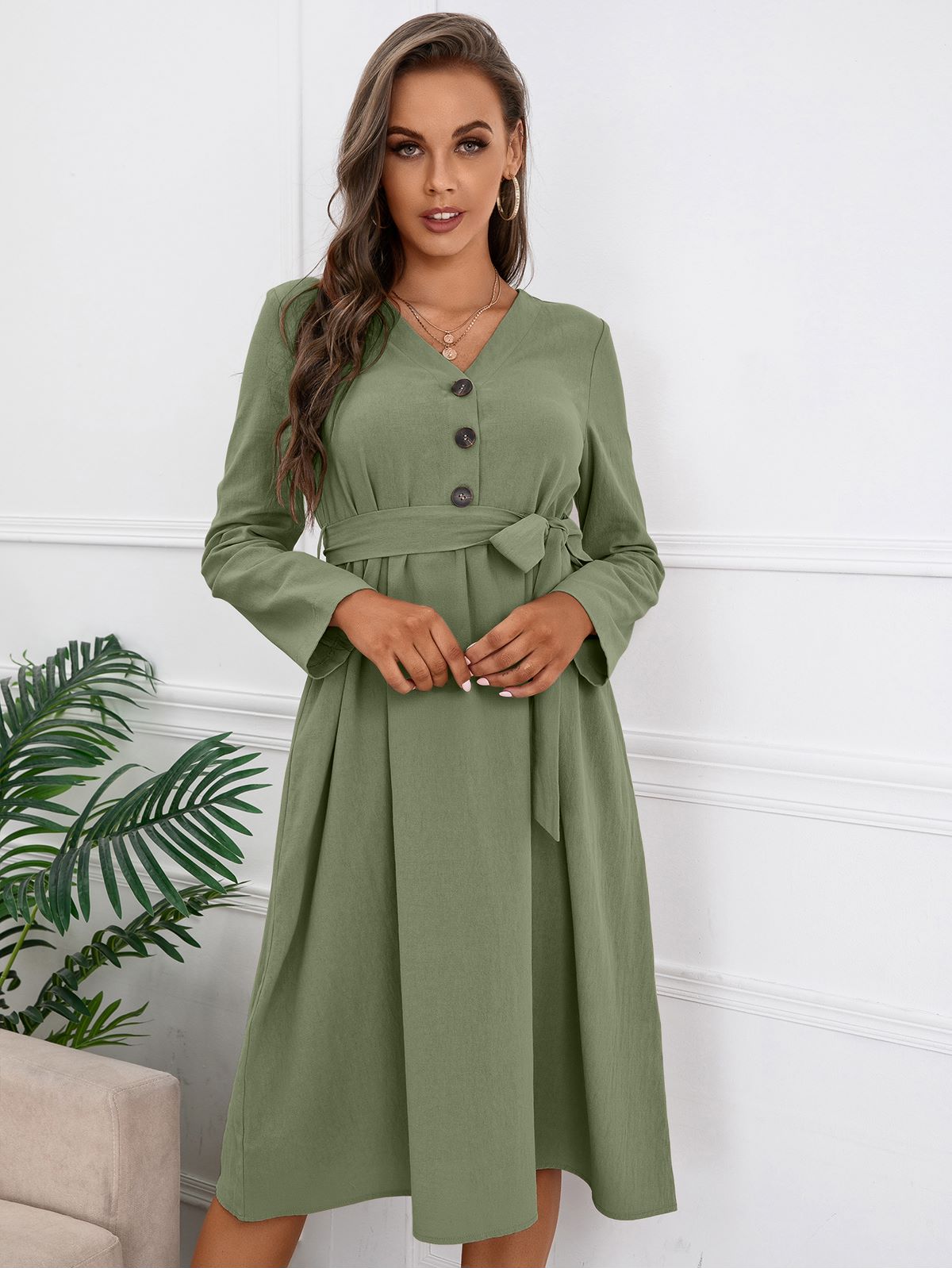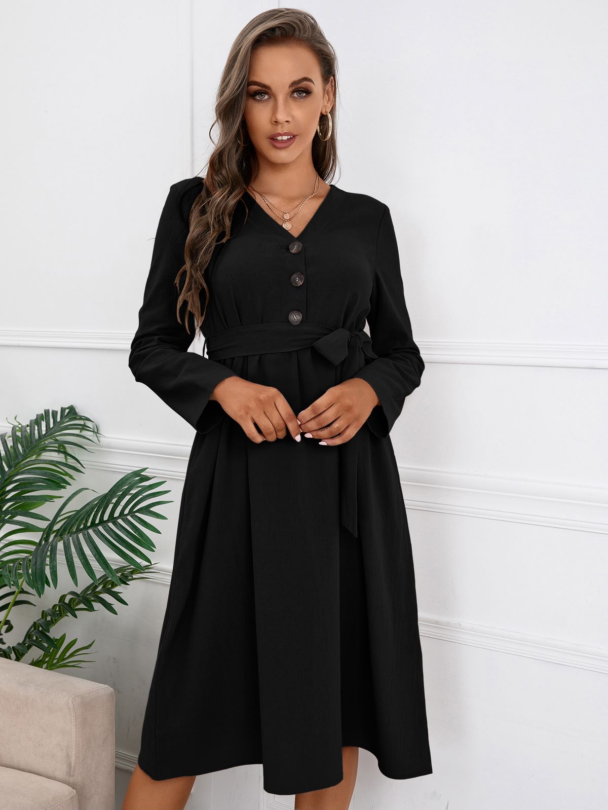 Vibemartini dress is detailed with a classic ribbon belt tie that cinches the waist. Features a v neck line. contrast button down. long sleeves. a-line silhouette. and knee length. Pair it with high boots and a purse for an amazing look.