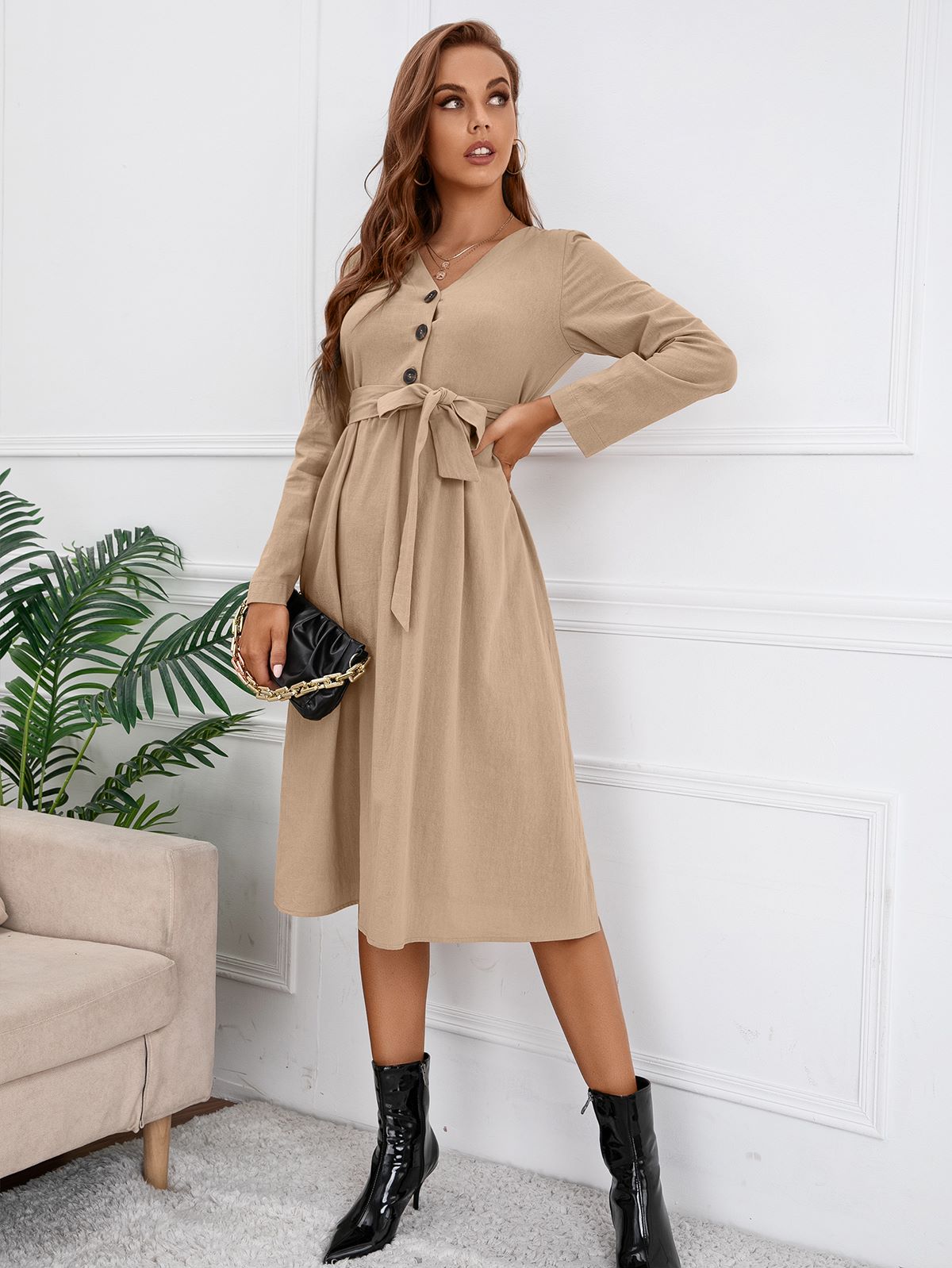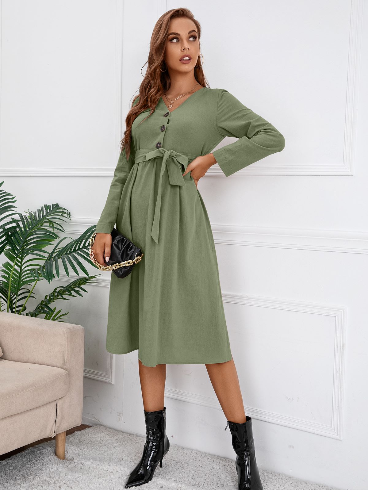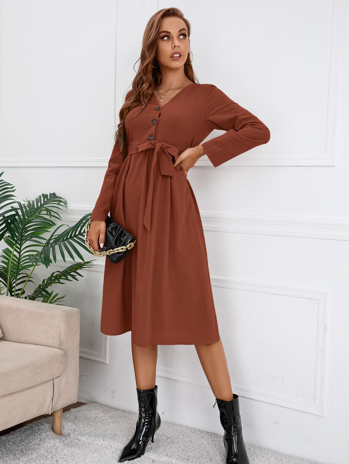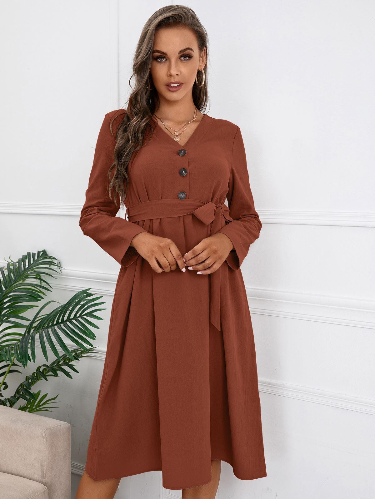 Vibemartini dress is detailed with a classic ribbon belt tie that cinches the waist. Features a v neck line. contrast button down. long sleeves. a-line silhouette. and knee length. Pair it with high boots and a purse for an amazing look.
