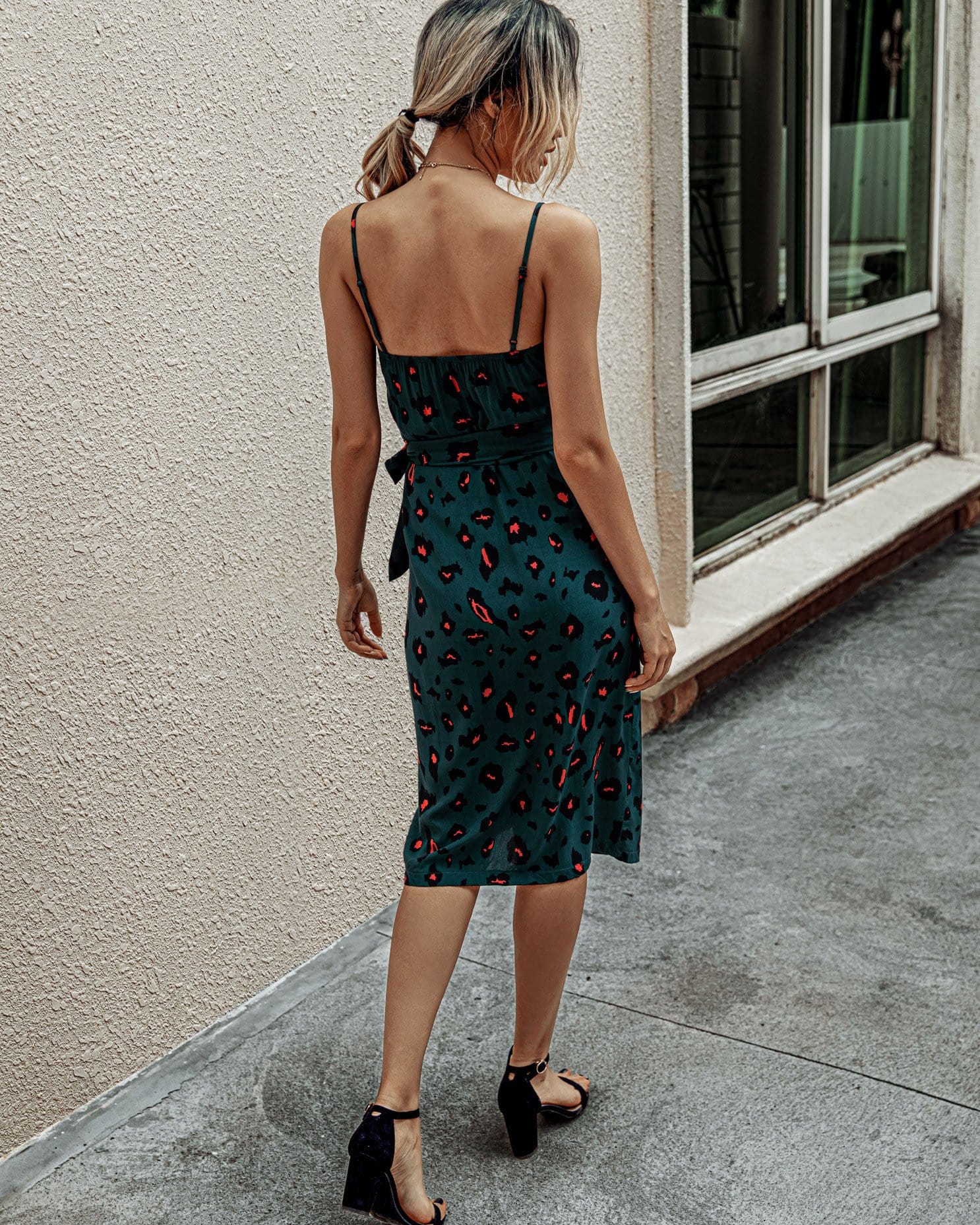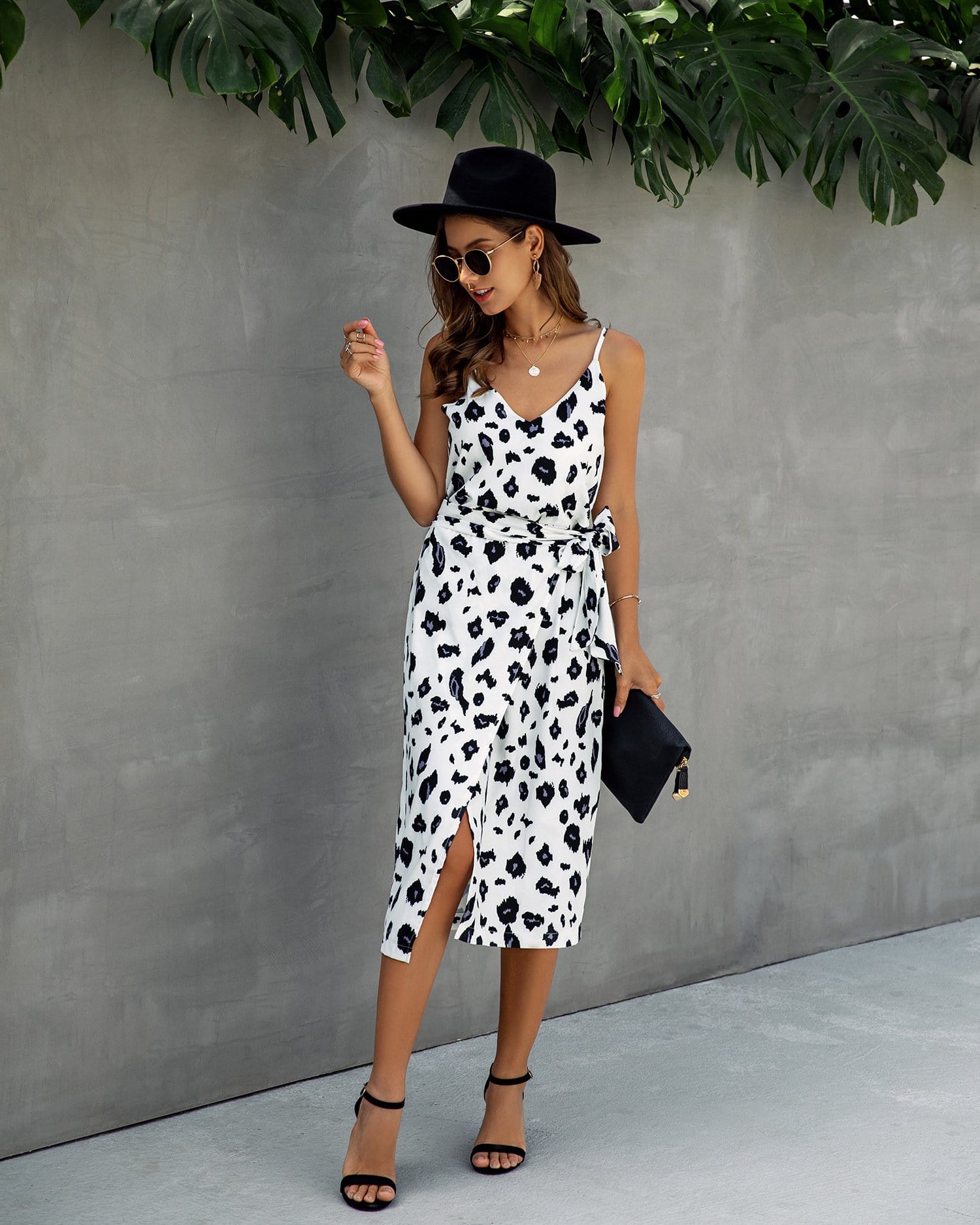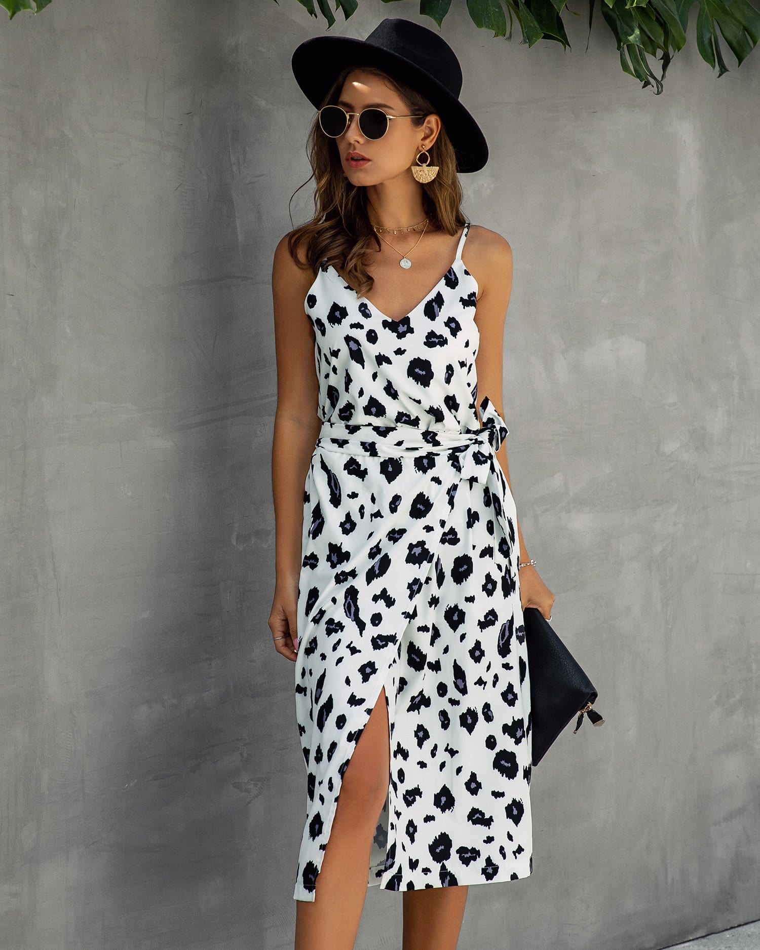 Vibemartini dress is detailed with bold animal prints. Features a v neck line. spaghetti straps. wrap style. straight fit. and below knee length. Pair it with strappy heels and your favorite bag for a gorgeous look.
