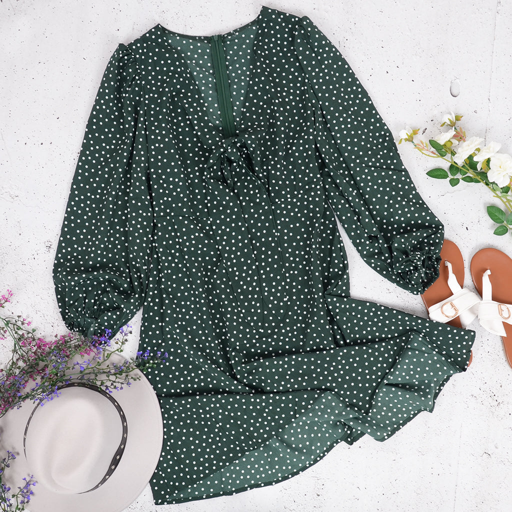 Vibemartini dress is detailed with the cutest tied bow front that adds that eye catching look to your dress. Features polka dot patterns all over the green dress. v neck line. long sleeves. and knee length dress. Pair it with your favorite jacket and heels for a dinner date this fall season.