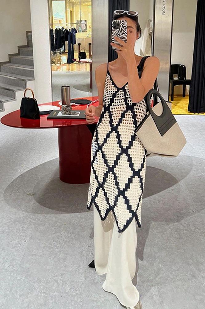 Step into the spotlight with our V-Neck Woven Hollow Diamond Lattice Sling Dress! Show off your bold and adventurous side with its daring lattice design and eye-catching cut. Perfect for those who aren't afraid to take risks and make a statement. Elevate your style and embrace your inner thrill-seeker with this dress!