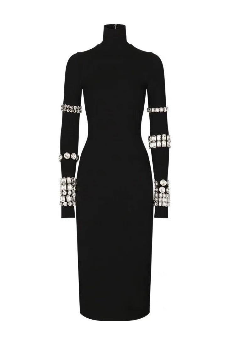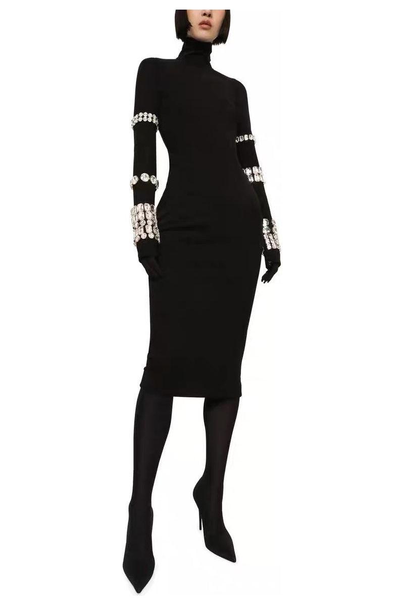 Embrace your bold, adventurous side with our Diamond black high collar long sleeve tight dress. Show off your fearless style with its striking design and form-fitting silhouette. Take risks and make a statement in this daring dress. Perfect for nights out on the town or special occasions. Don't be afraid to stand out!