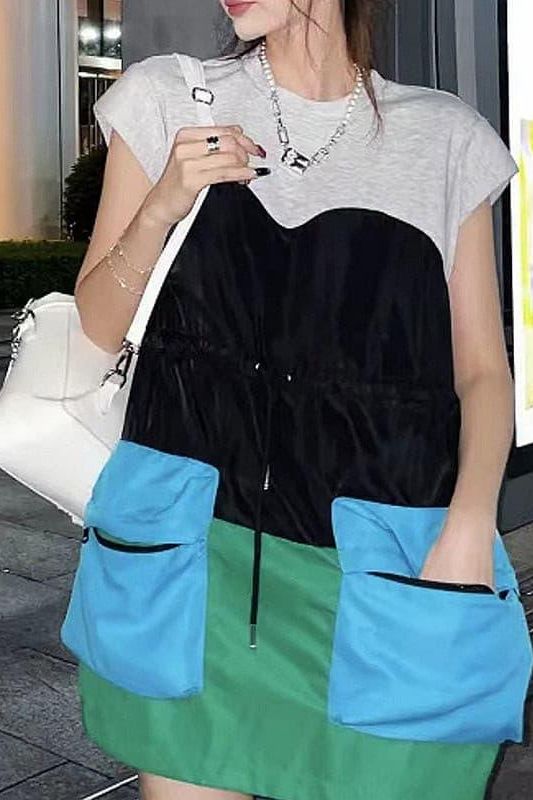 This dress features a classic loose-fit silhouette with drawstring detailing and a playful color-blocking design. The lightweight fabric is breathable and soft, providing a comfortable fit while the drawstring can be adjusted to ensure a perfect fit every time. Ideal for a variety of occasions, this dress is sure to become a staple in your wardrobe.
