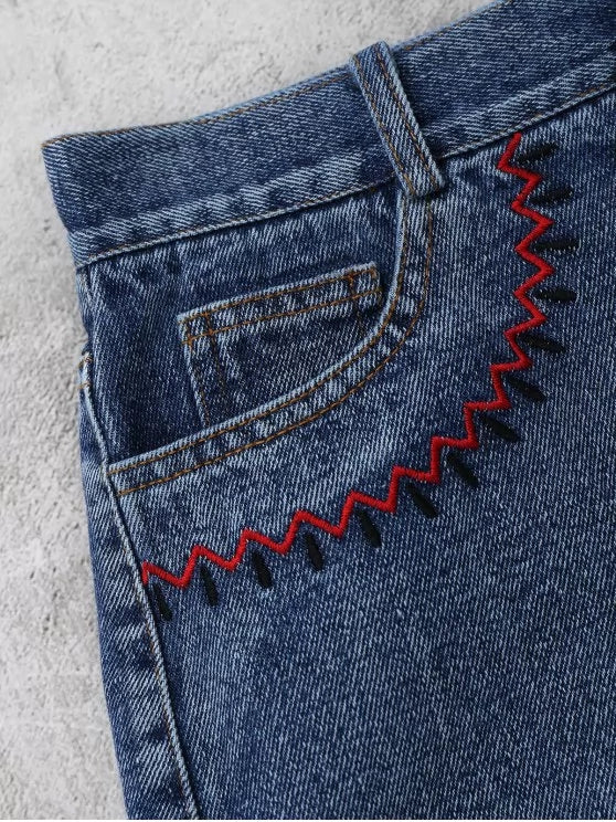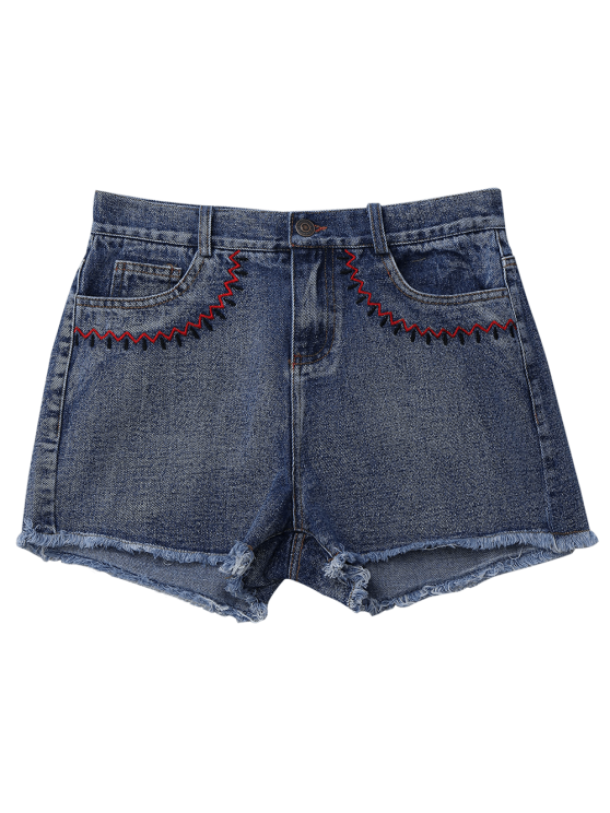 Denim mini shorts features a zig-zag embroidery graphic along the two front pockets.