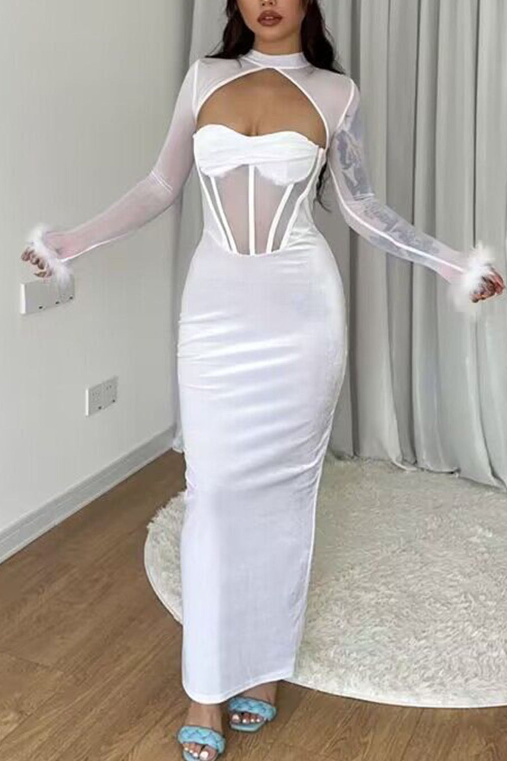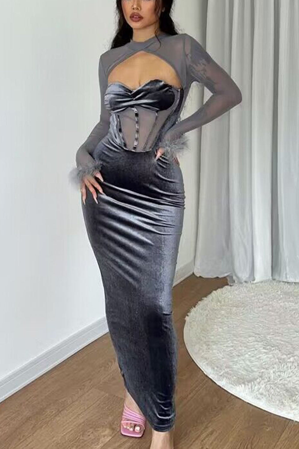 Plush Mesh Patchwork Corset Hollow Midi Dress