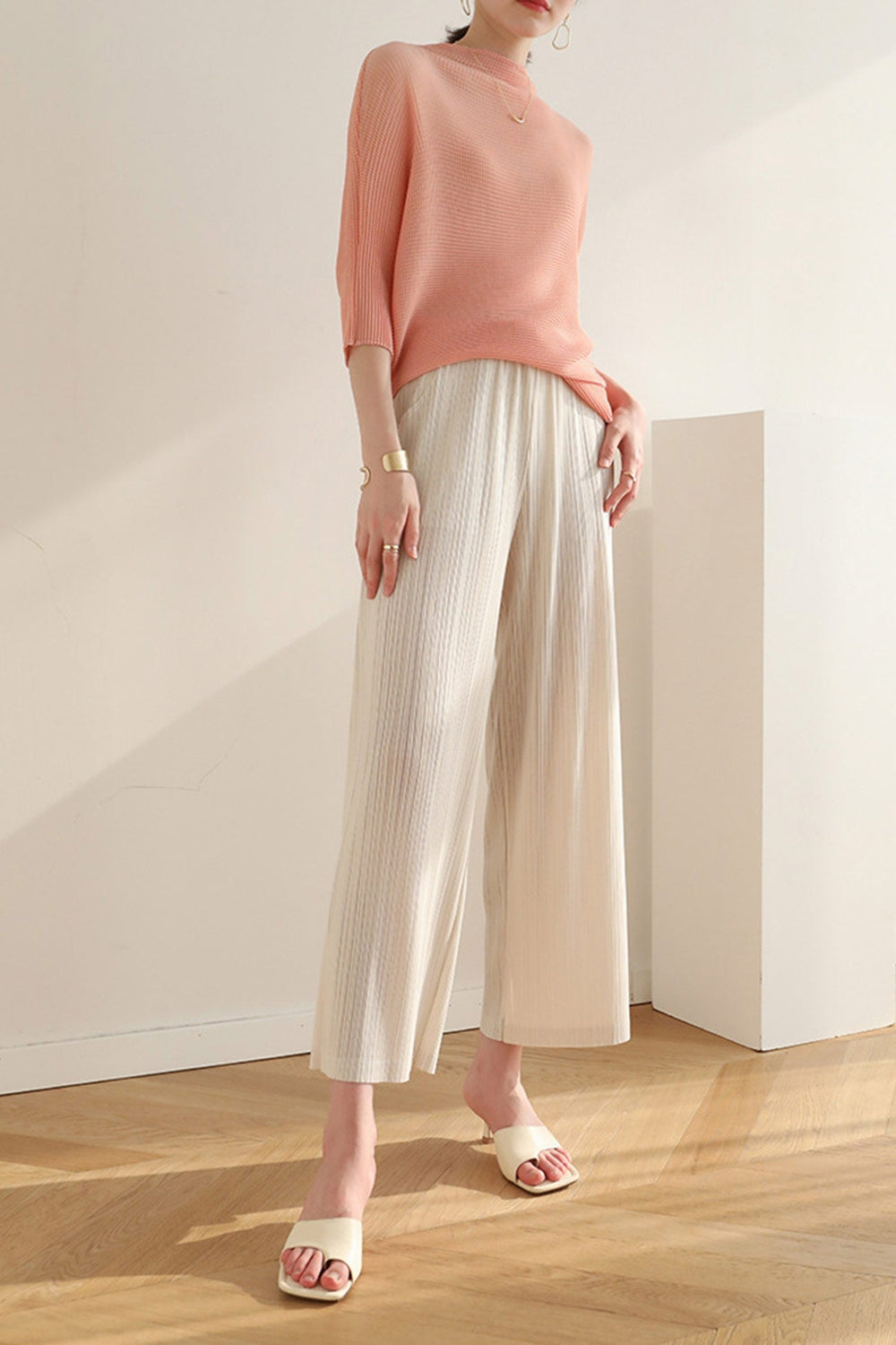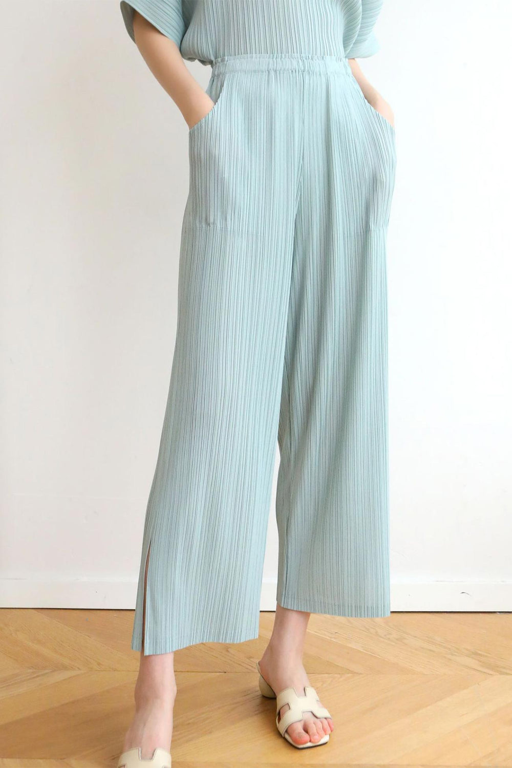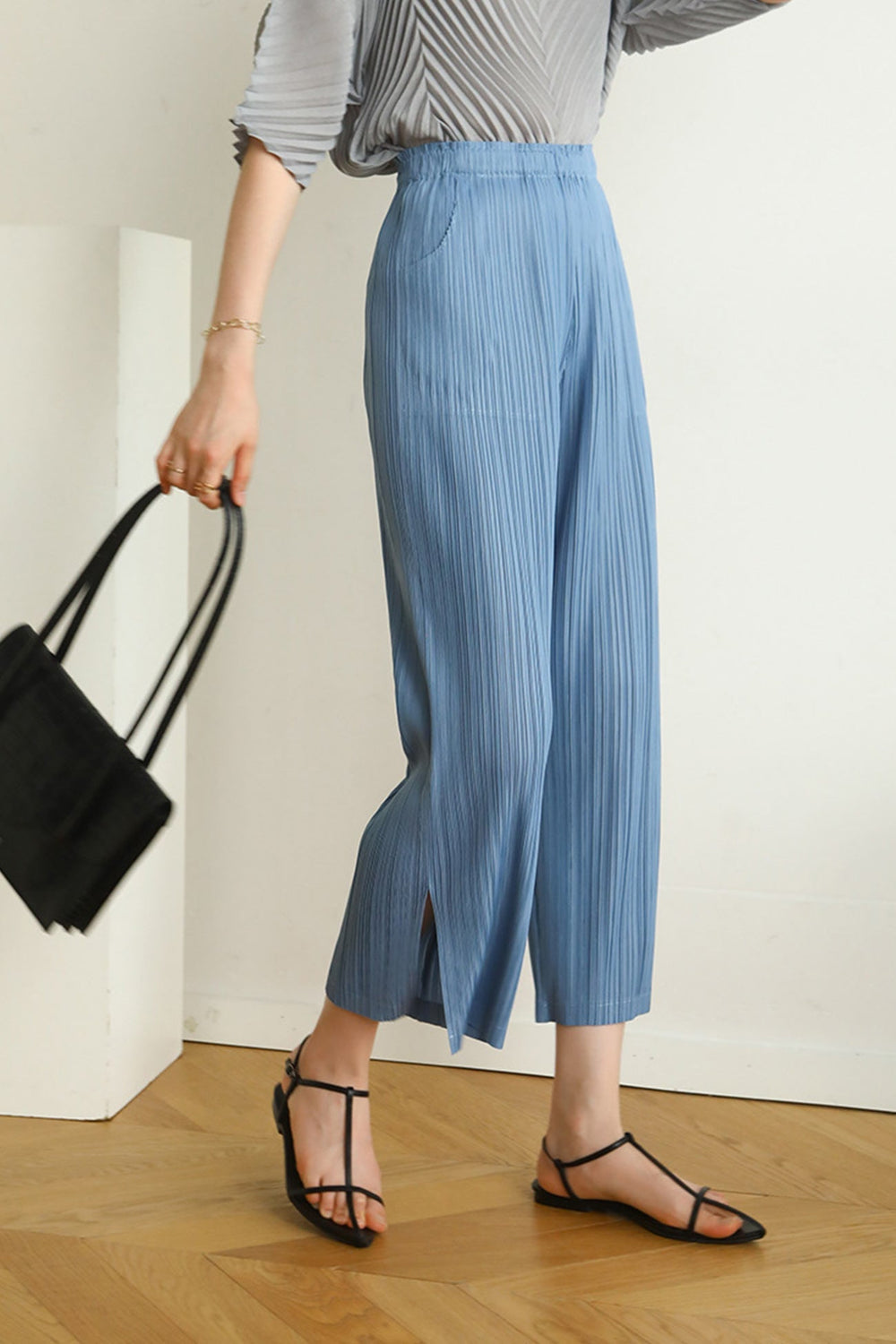 This pant is casual and chic.?It's light and dropped?smooth due to its pleated style. You'd feel comfortable due to the two pockets and elastic waistband. Easy to walk and sit.? Perfect to go with simple tops.