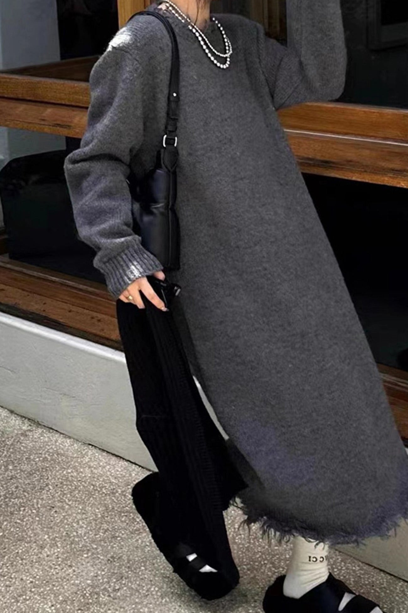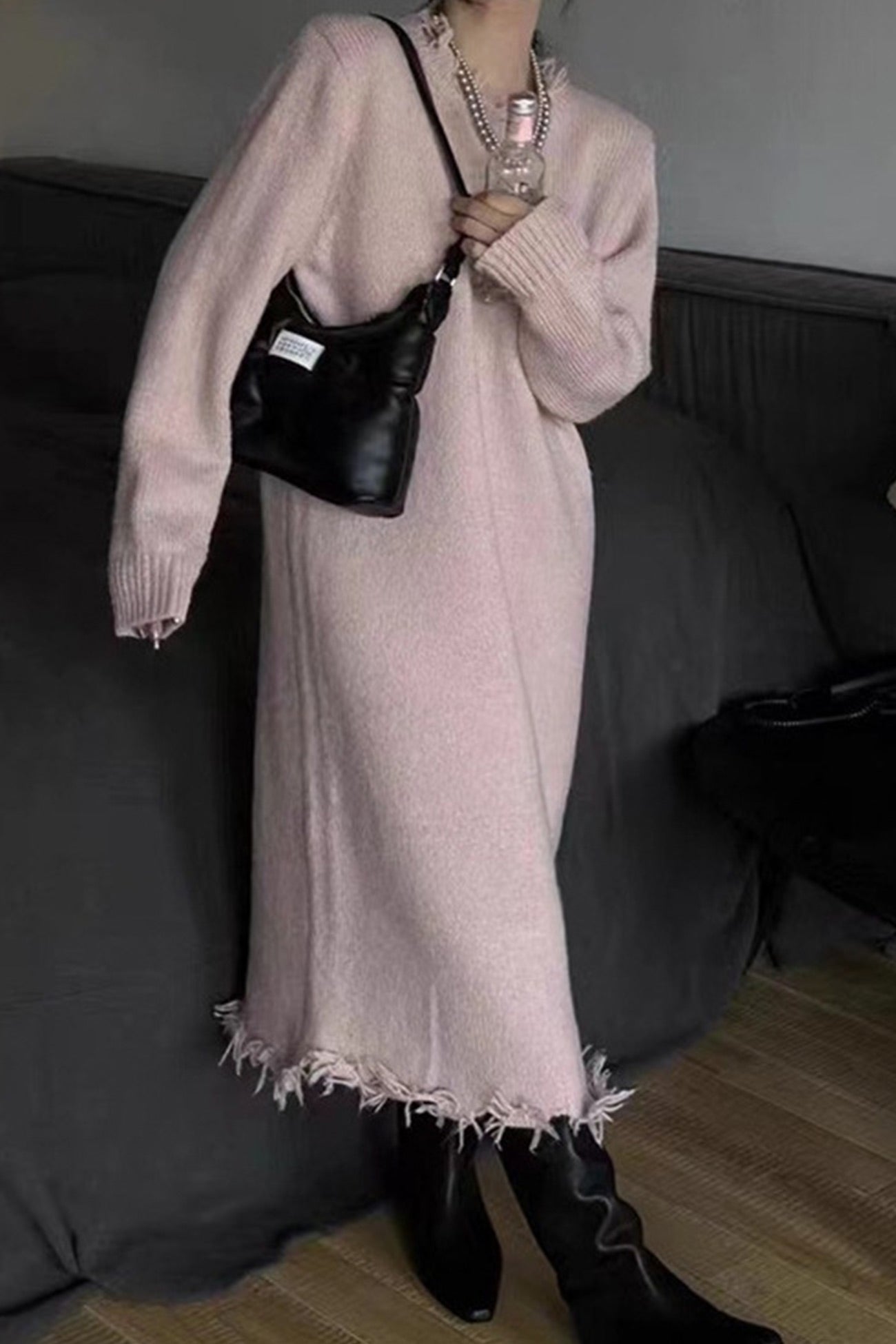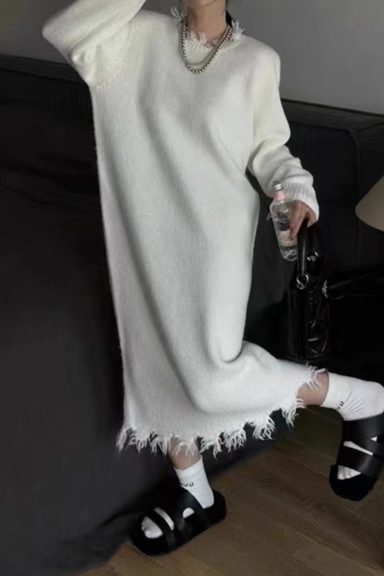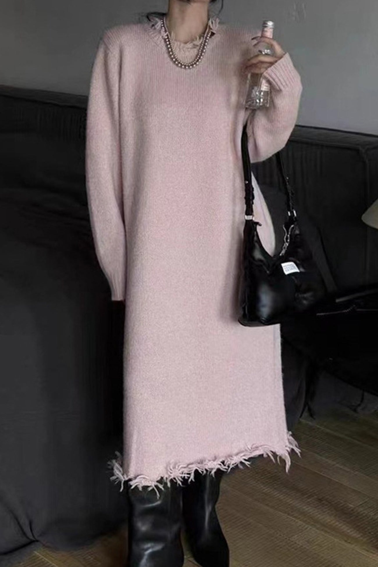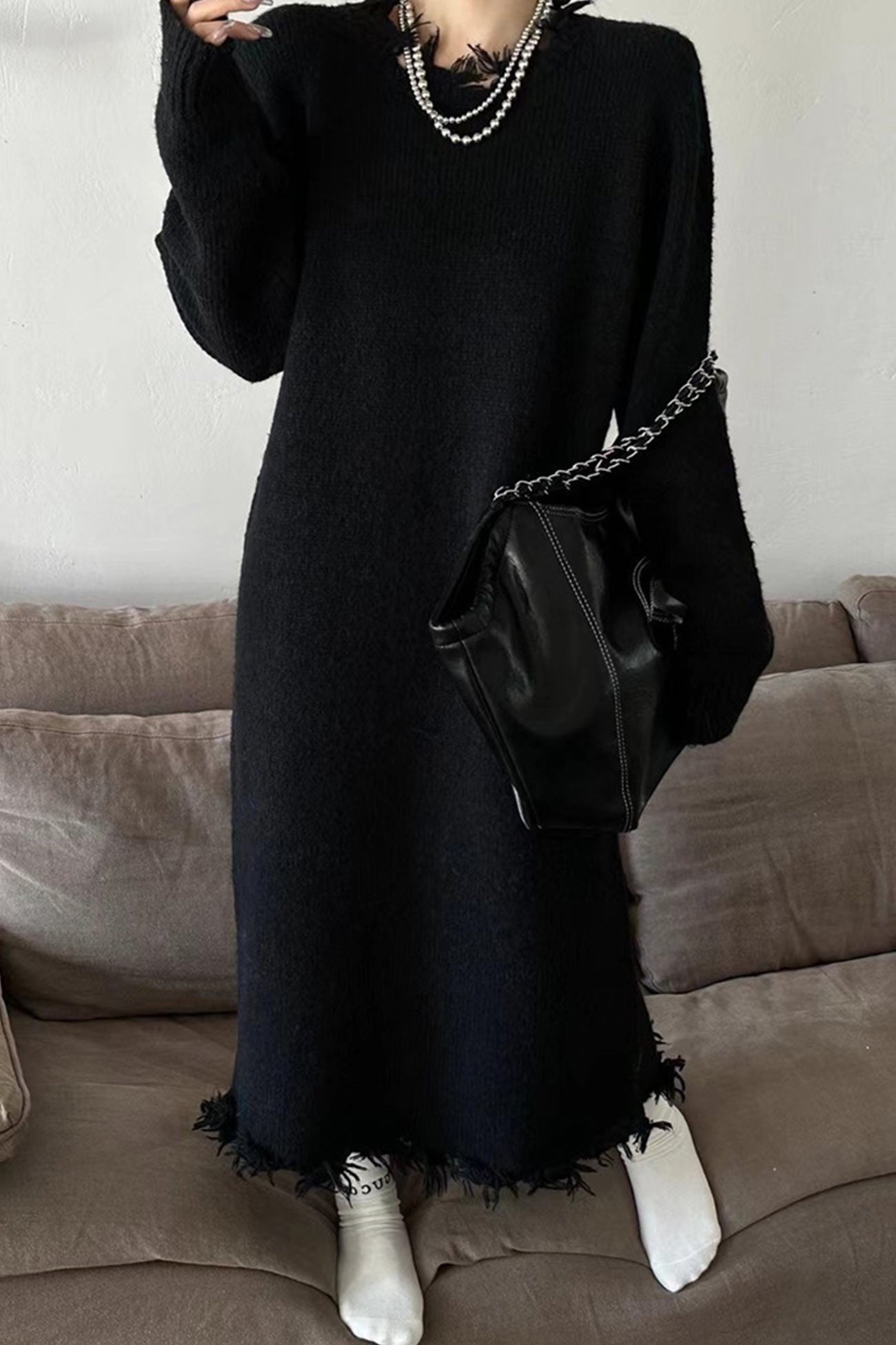 Solid Distressed Raw Edge Knit Dress