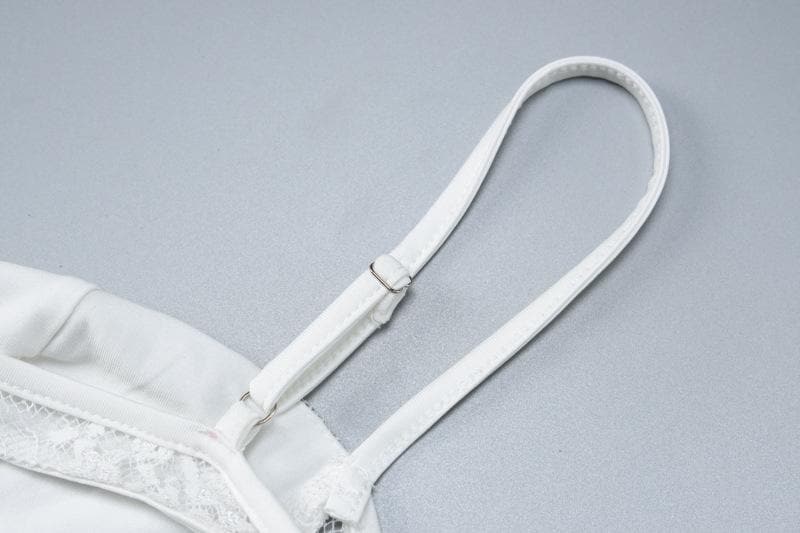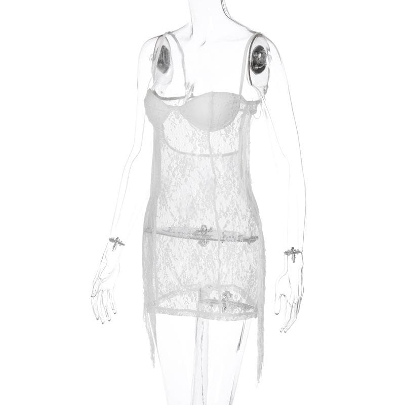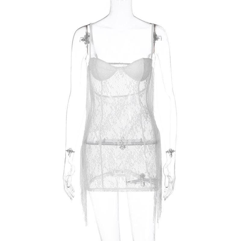 Tassels low cut see through lace solid backless cami mini dress