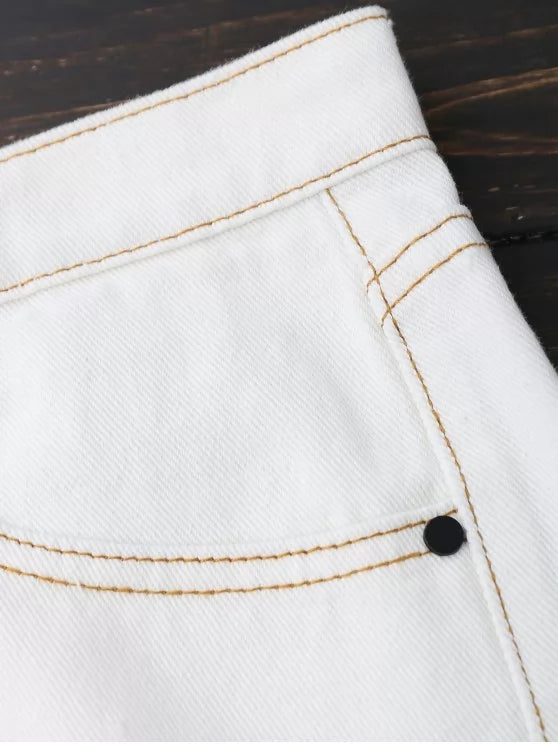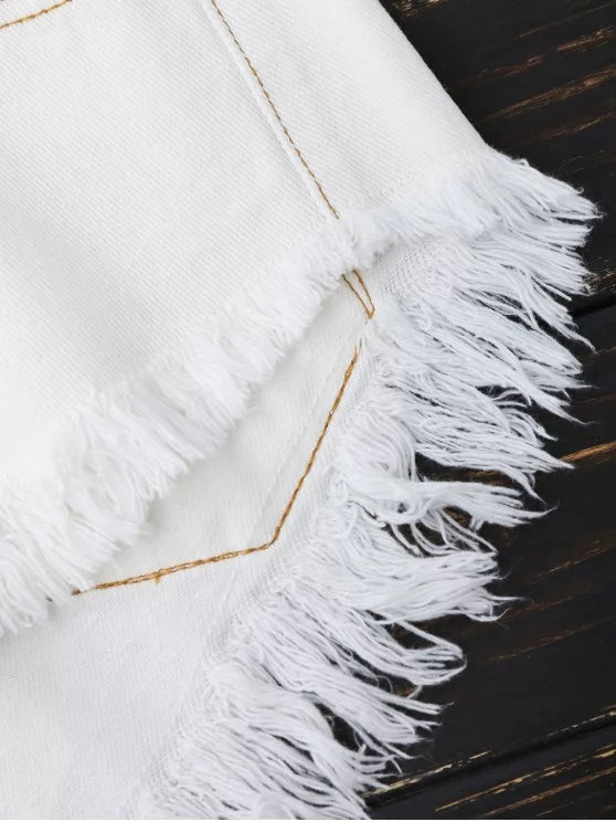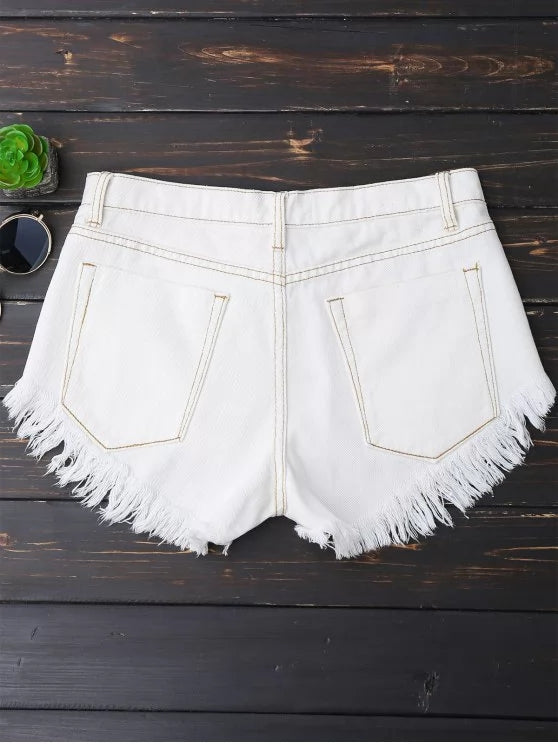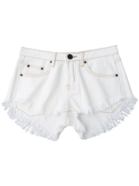 This cutoffs shorts features a raw fringe and high-low hem with stitches color differing from the pants color.