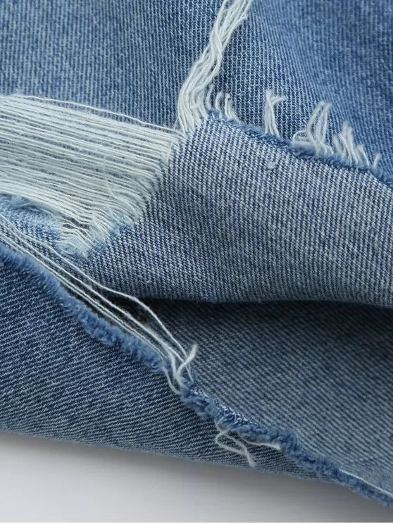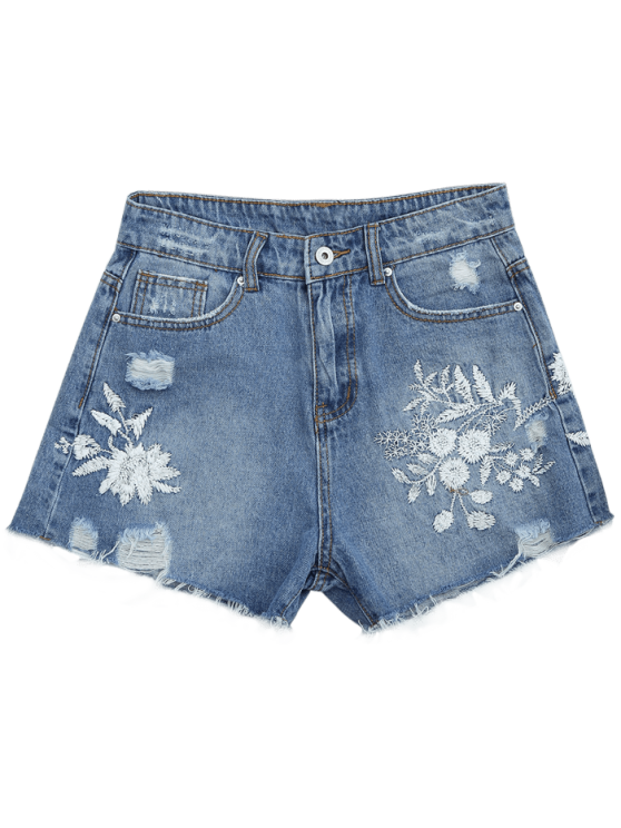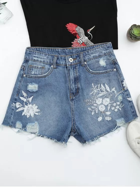 This jean shorts features a white floral embroidered graphic details and a frayed fabric front with cutoffs hem and a five-pocket design.
