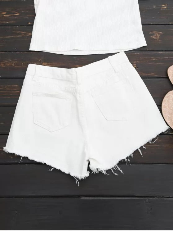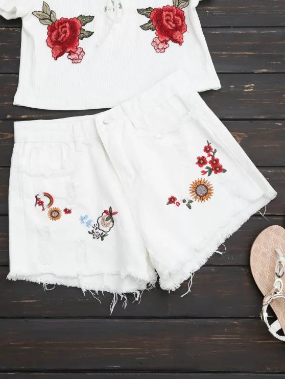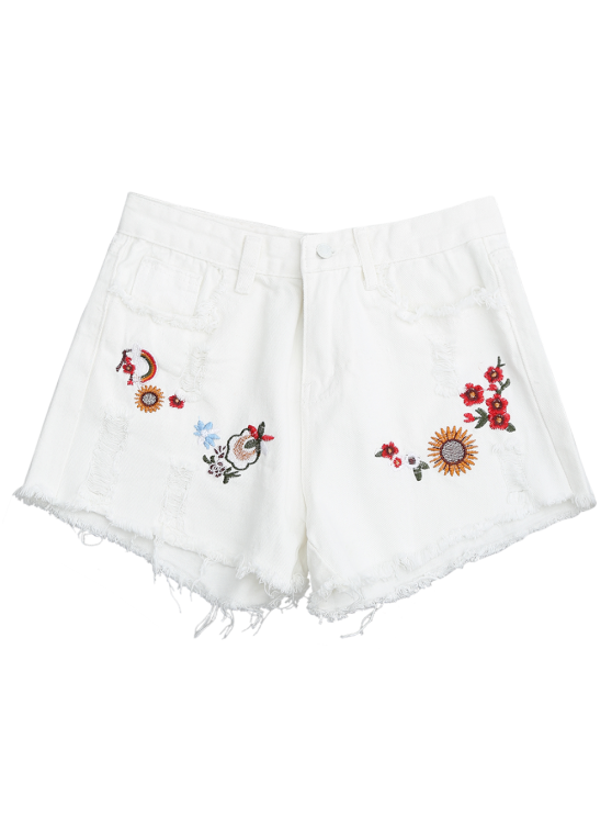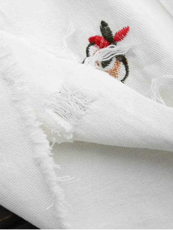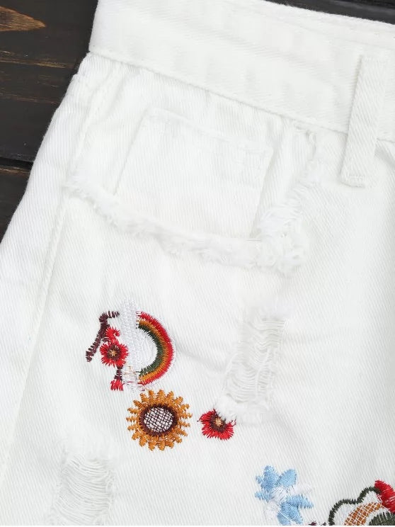 Trendy Embroidered Frayed Hem Ripped Denim Short