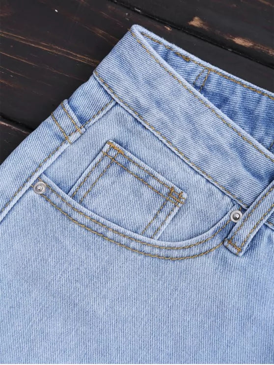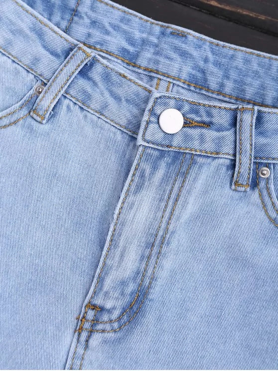 This jean shorts features a embroidered graphic detail and a scalloped hem in a five-pocket style.